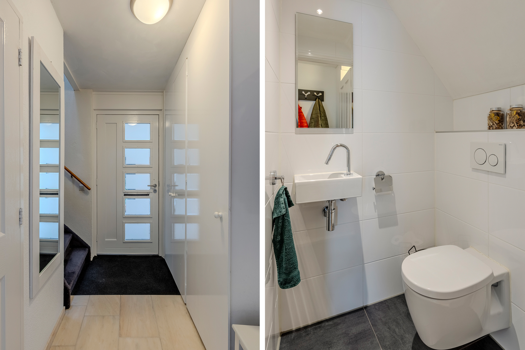 Entree, hal met marmeren vloer, meterkast (met glasvezel aansluiting) en een moderne toiletruimte (2021) voorzien van een vrij hangend toilet, fontein en strak stucwerkplafondafwerking met een inbouwspot.