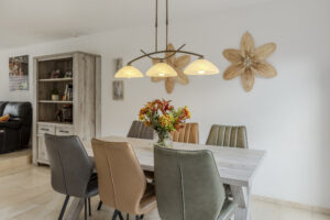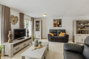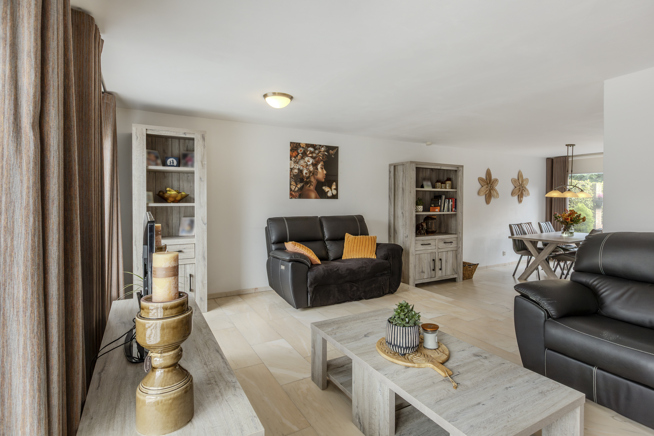 Sfeervolle en ruime woonkamer circa 45m² (inclusief keuken) met marmeren vloer voorzien van vloerverwarming, spachtelputz wandafwerking, schuurwerk plafondafwerking en een schouw met open haard (op dit moment niet in gebruik). Het zitgedeelte is op een iets hoger niveau gelegen. Aan de achterzijde bevindt zich het eetgedeelte met een schuifpui naar de achtertuin. In de woonkamer is veel glas aanwezig wat voor veel lichtinval zorgt.