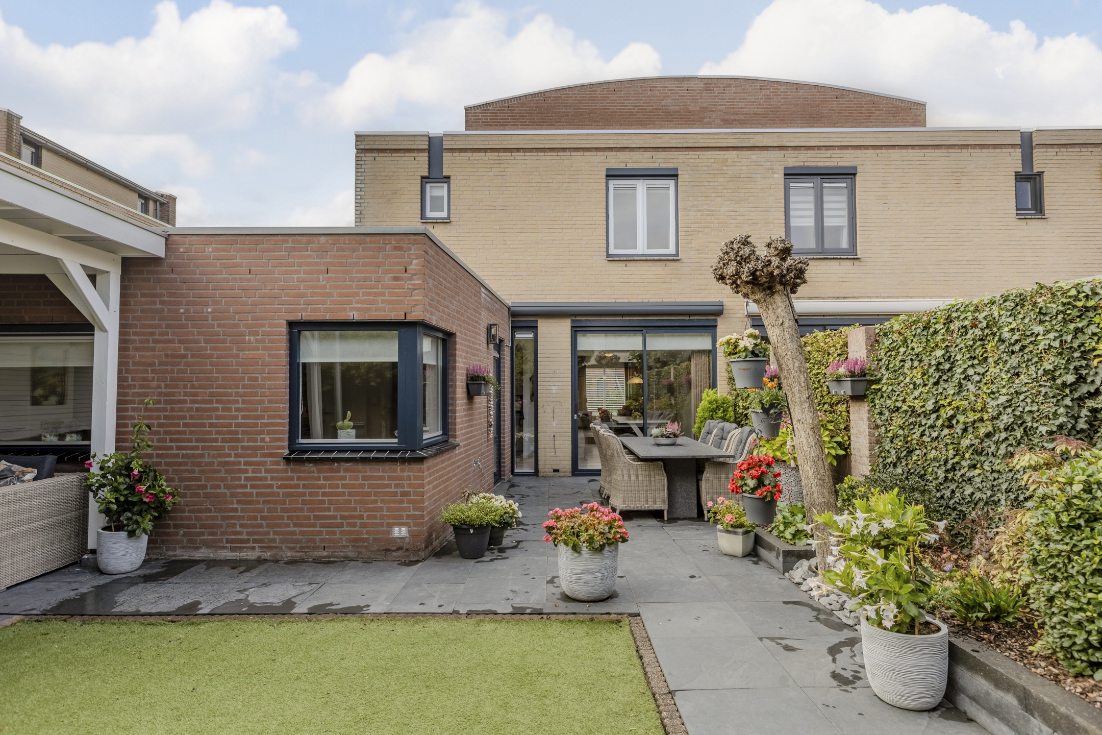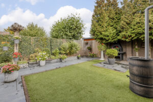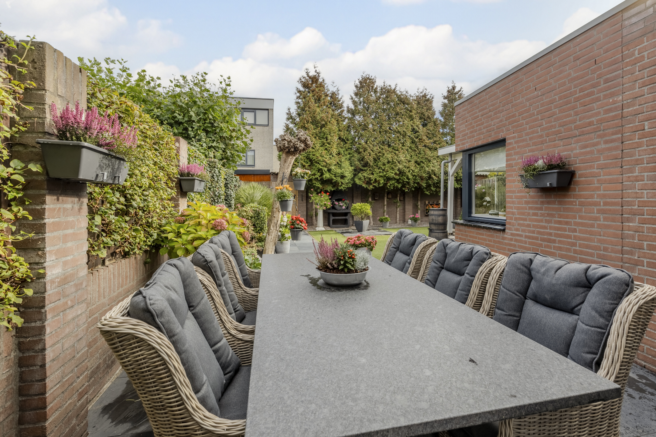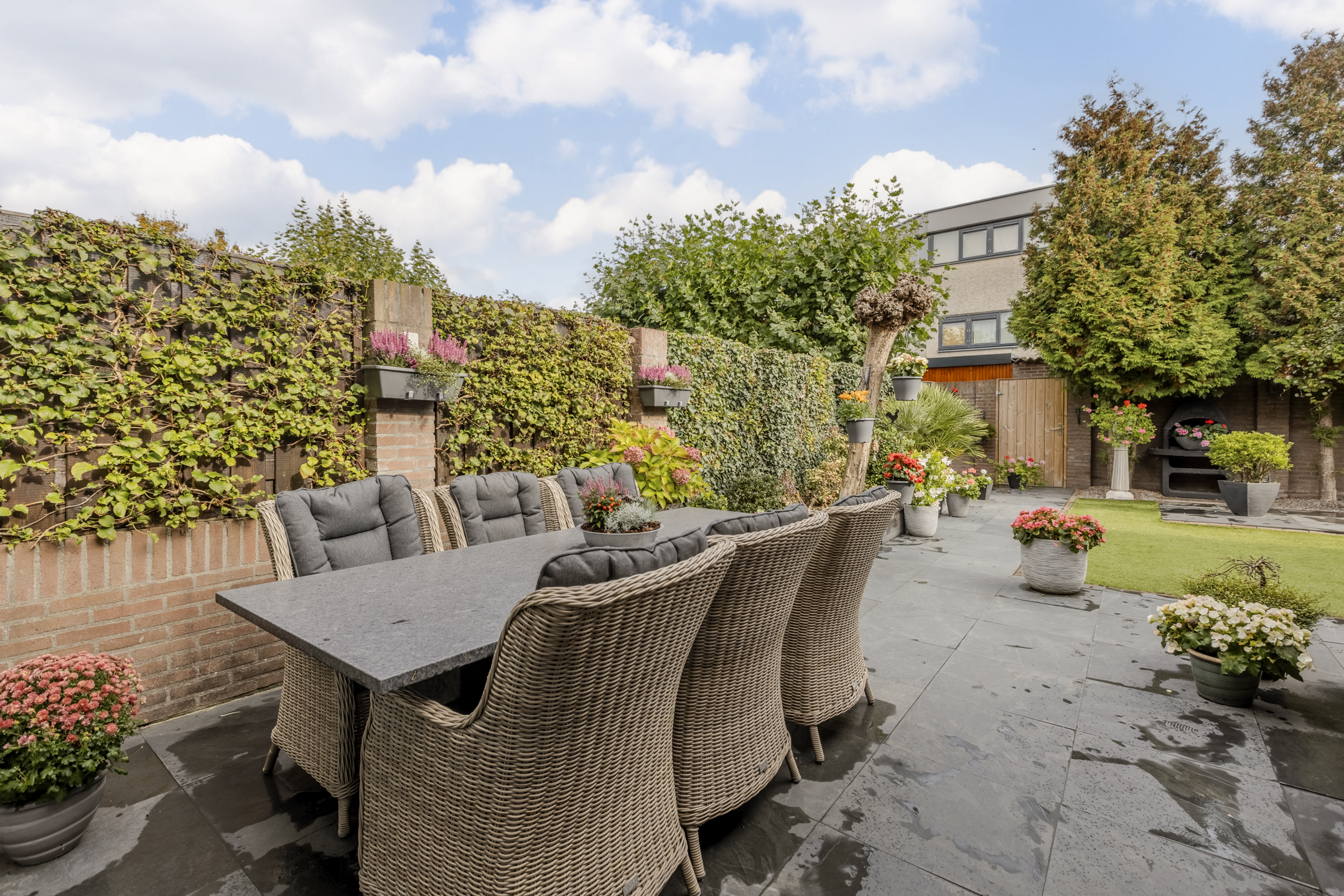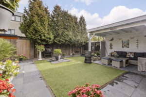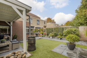 De ruime achtertuin is heerlijk diep en breed van opzet. De fraai aangelegde achtertuin ligt op het oosten en is voorzien van een terras, gezellige houten veranda, kunstgras, diverse borders en een achterom (de poort is in 2023 vernieuwd). Aan de achterzijde van de woning is in 2024 een nieuwe elektrisch bedienbare zonwering geplaatst.