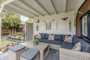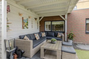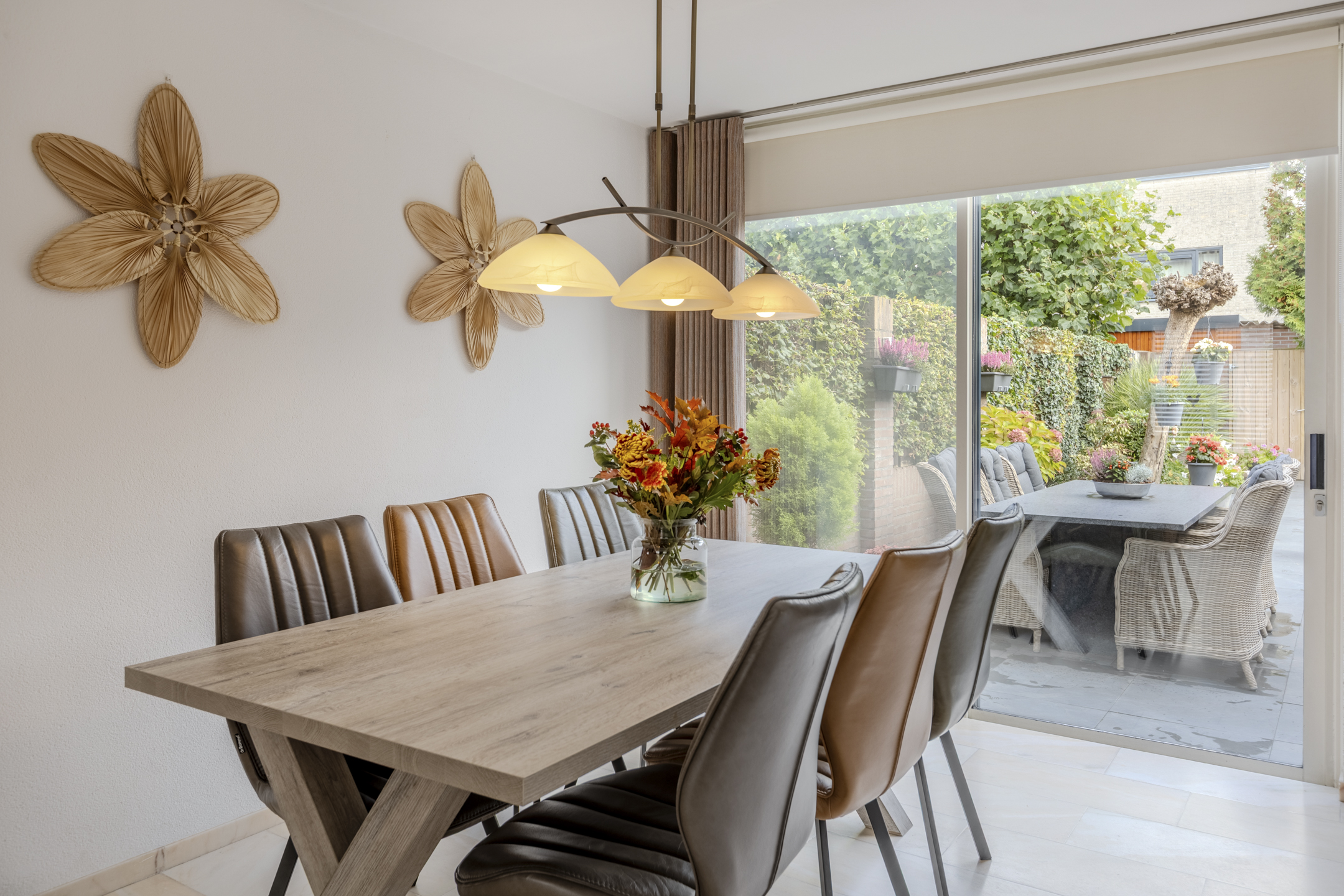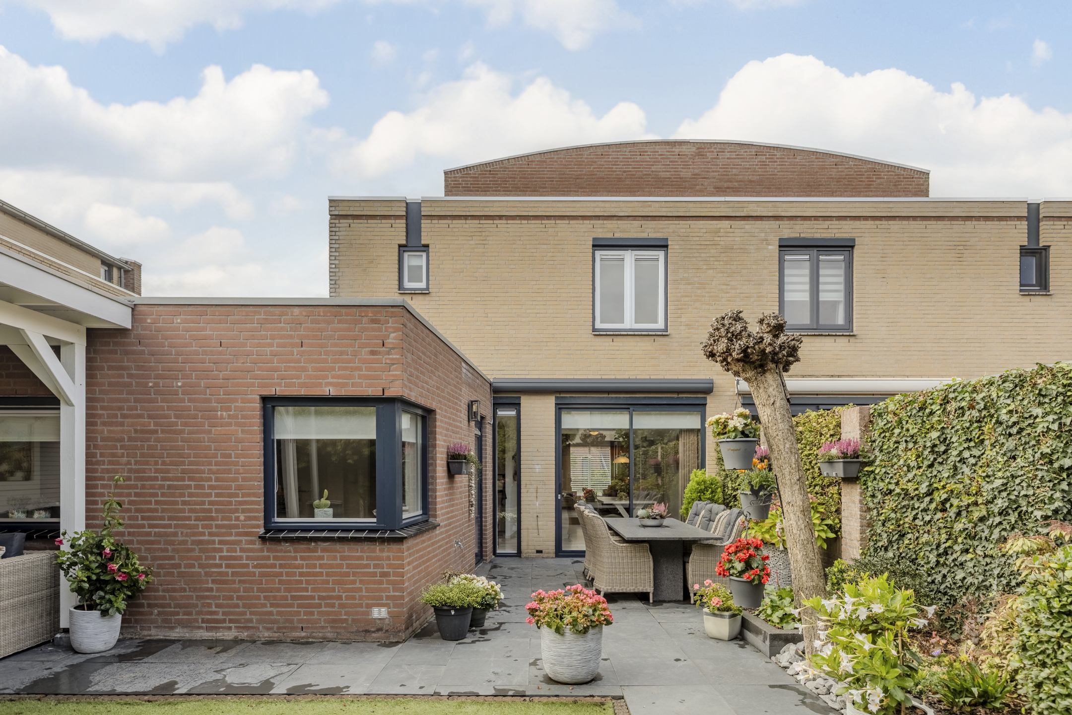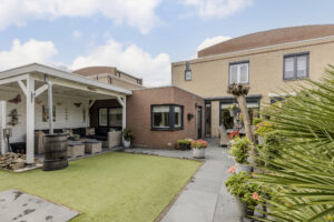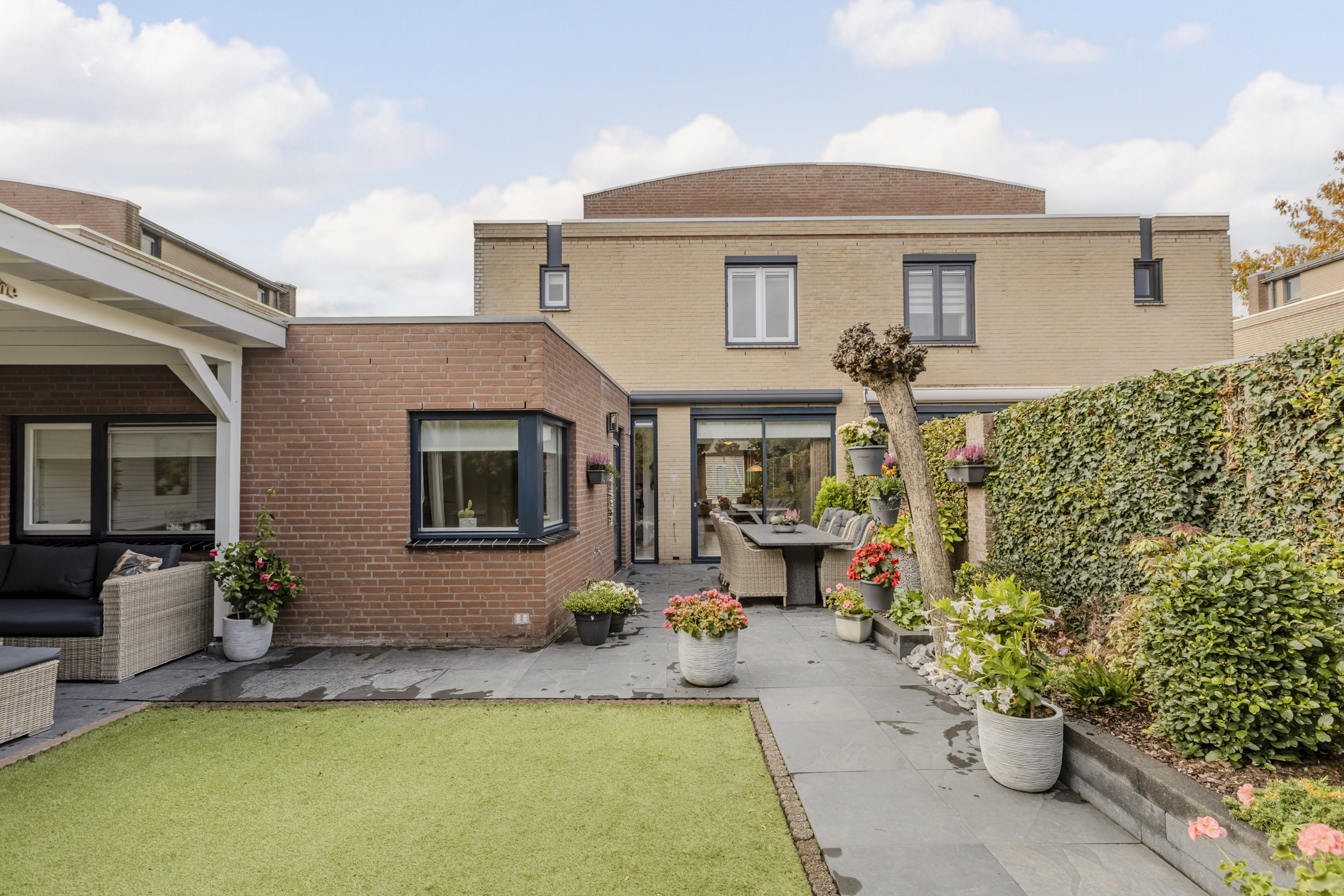 De ruime achtertuin is heerlijk diep en breed van opzet. De fraai aangelegde achtertuin ligt op het oosten en is voorzien van een terras, gezellige houten veranda, kunstgras, diverse borders en een achterom (de poort is in 2023 vernieuwd). Aan de achterzijde van de woning is in 2024 een nieuwe elektrisch bedienbare zonwering geplaatst.