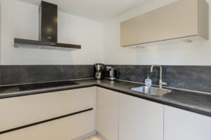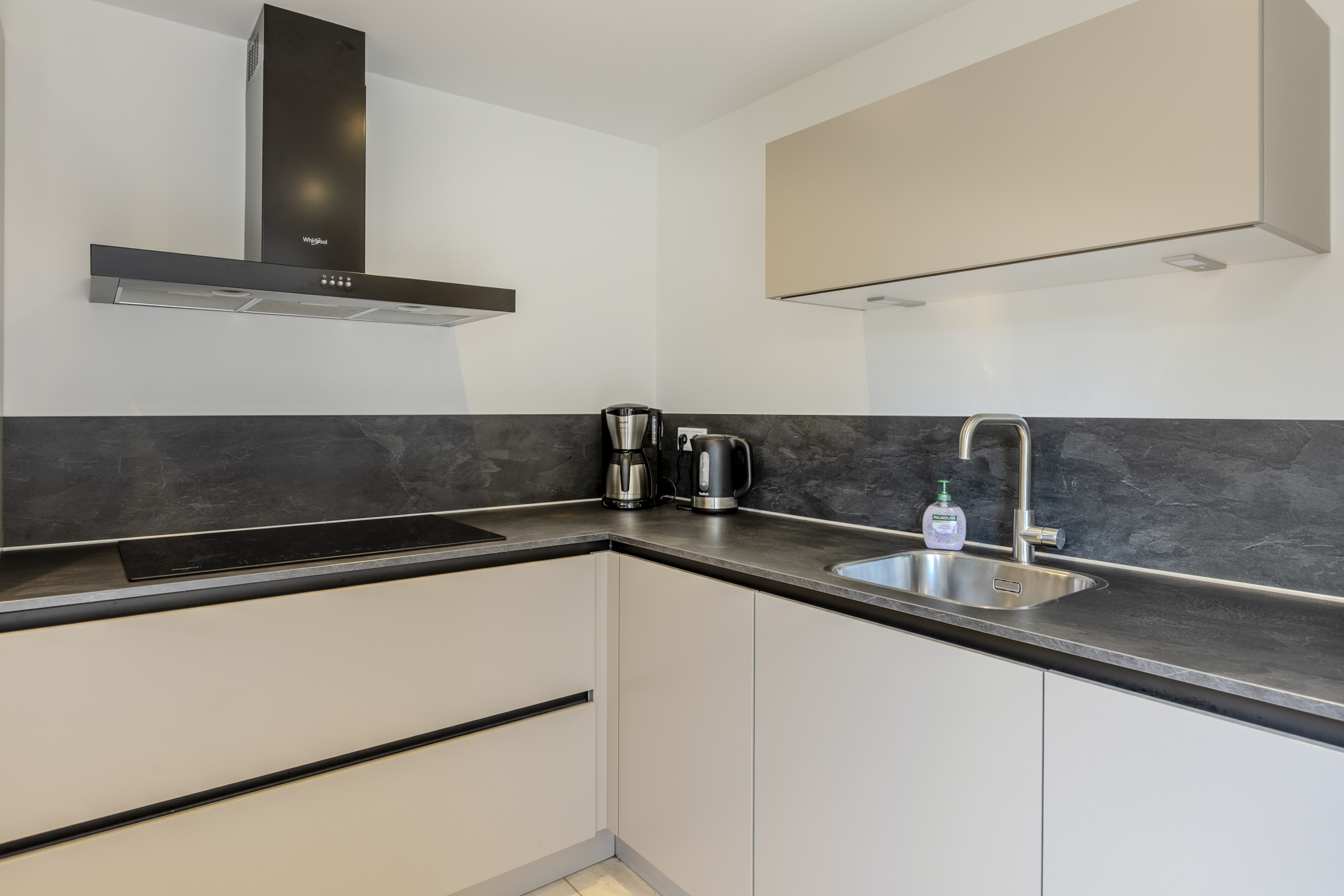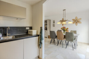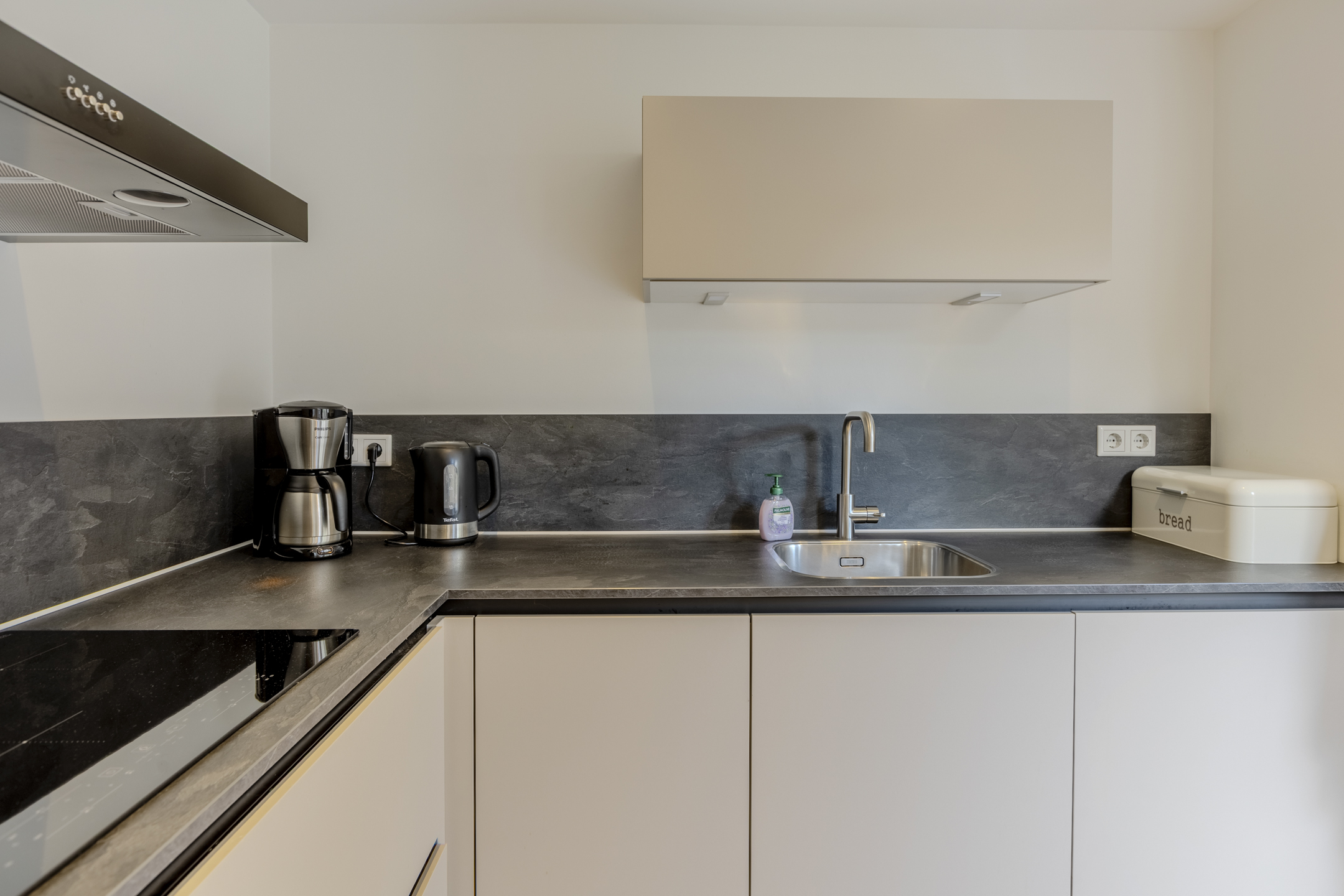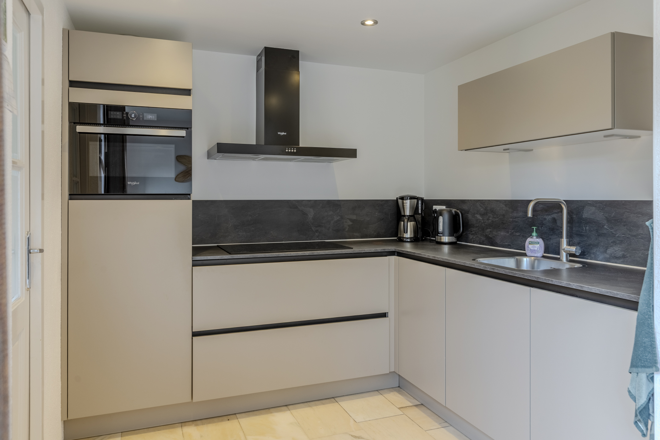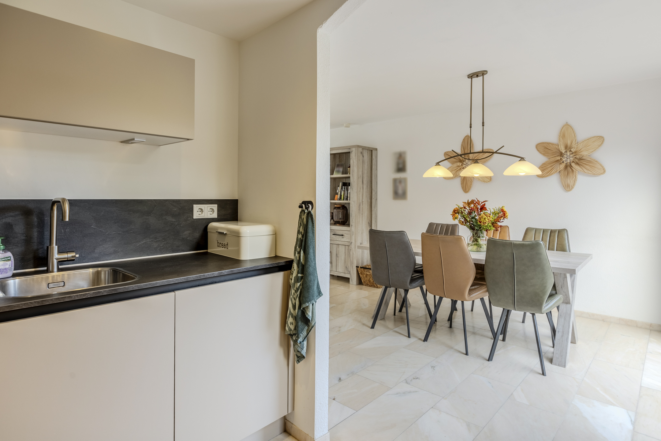 Aan de achterzijde van de woning is de semi open gelegen met moderne keukeninrichting (2022) in hoekopstelling. De keukeninrichting is voorzien van een inductie kookplaat, afzuigkap, koelkast en een combi magnetron. In keuken zijn daarnaast inbouwspots aanwezig.