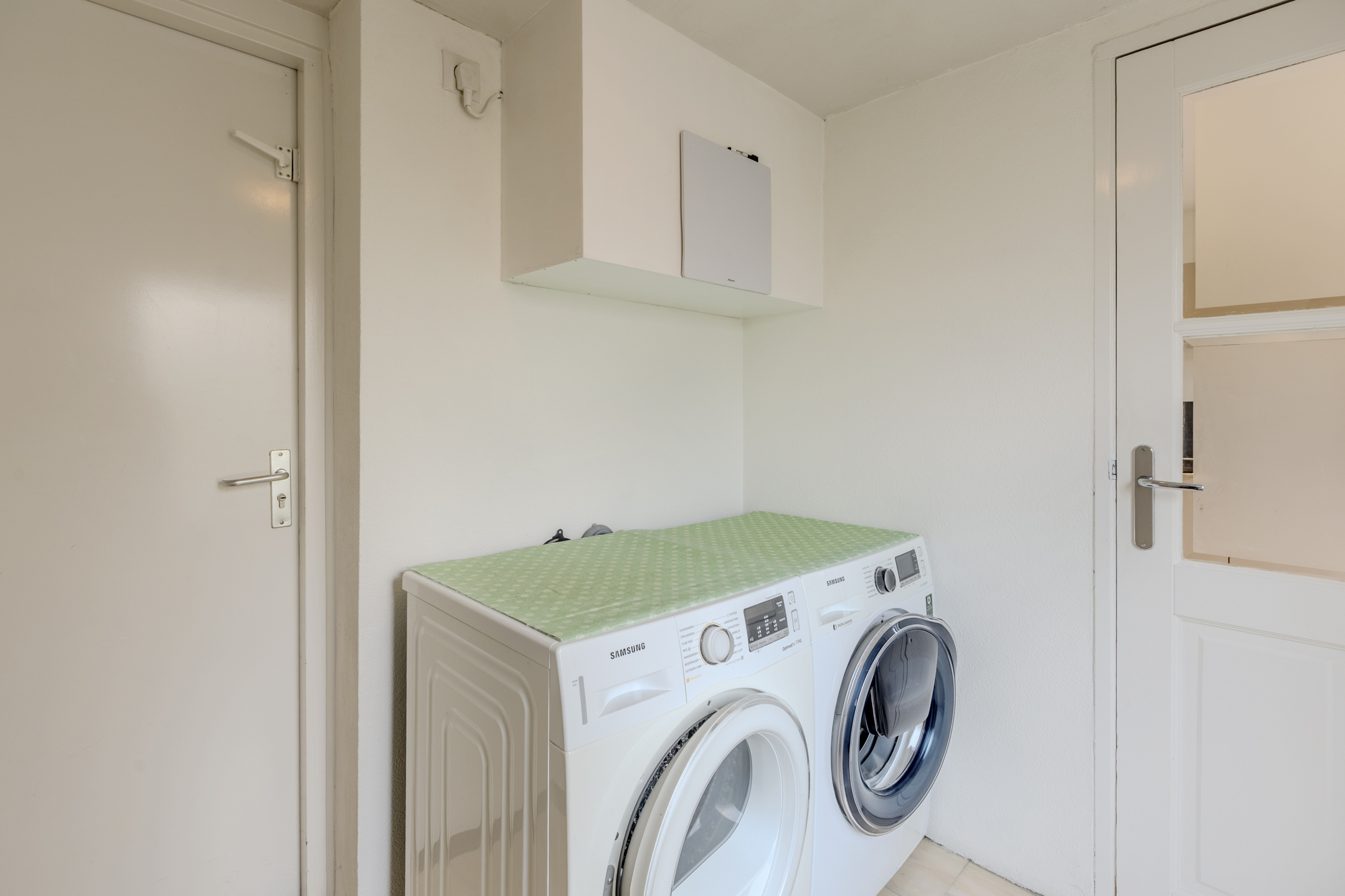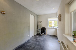 Praktische bijkeuken met dezelfde doorlopende marmeren vloer, spachtelputz wandafwerking en schuurwerk plafondafwerking. In de bijkeuken bevinden zich de aansluitingen voor de wasapparatuur en de unit voor de mechanische ventilatie.