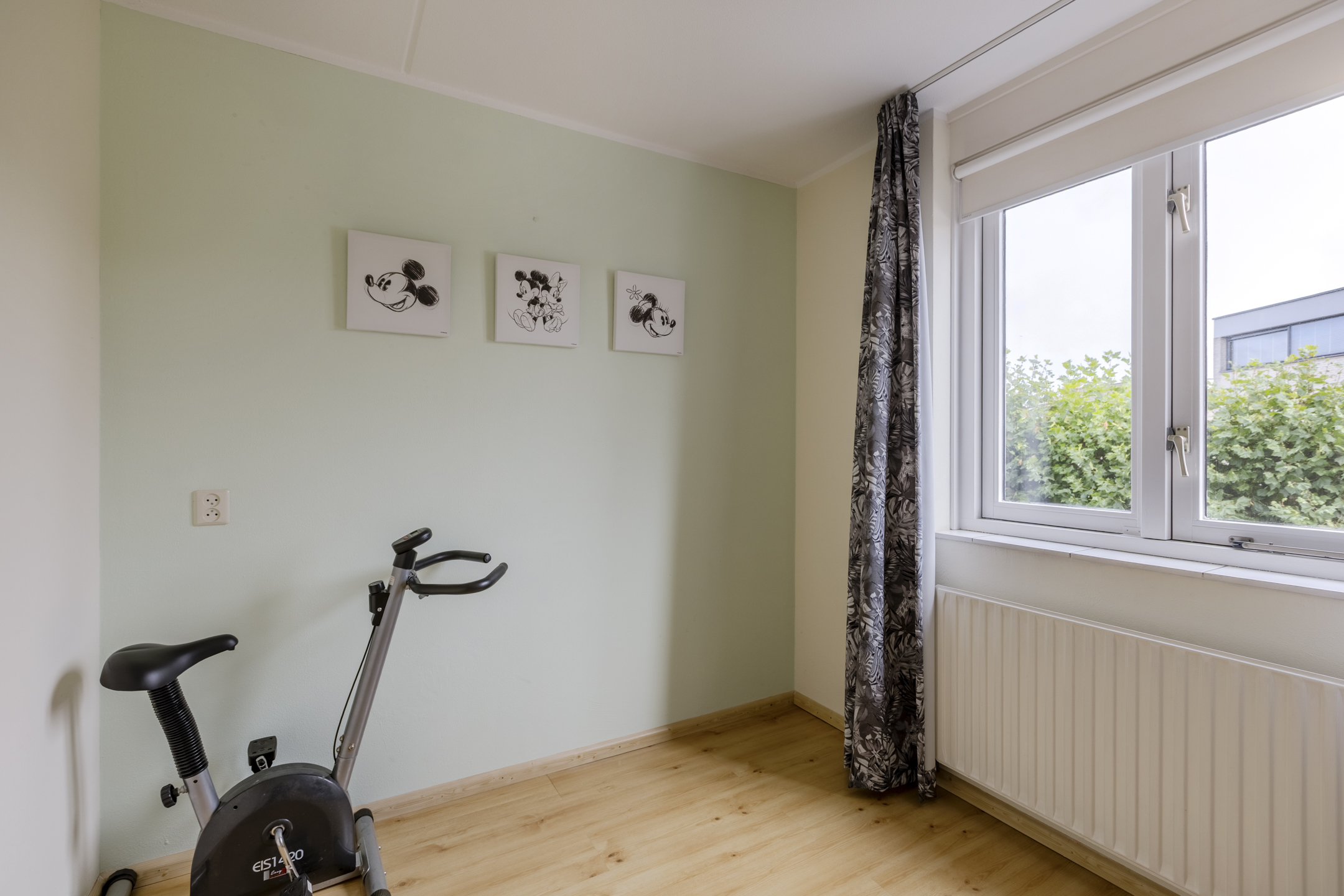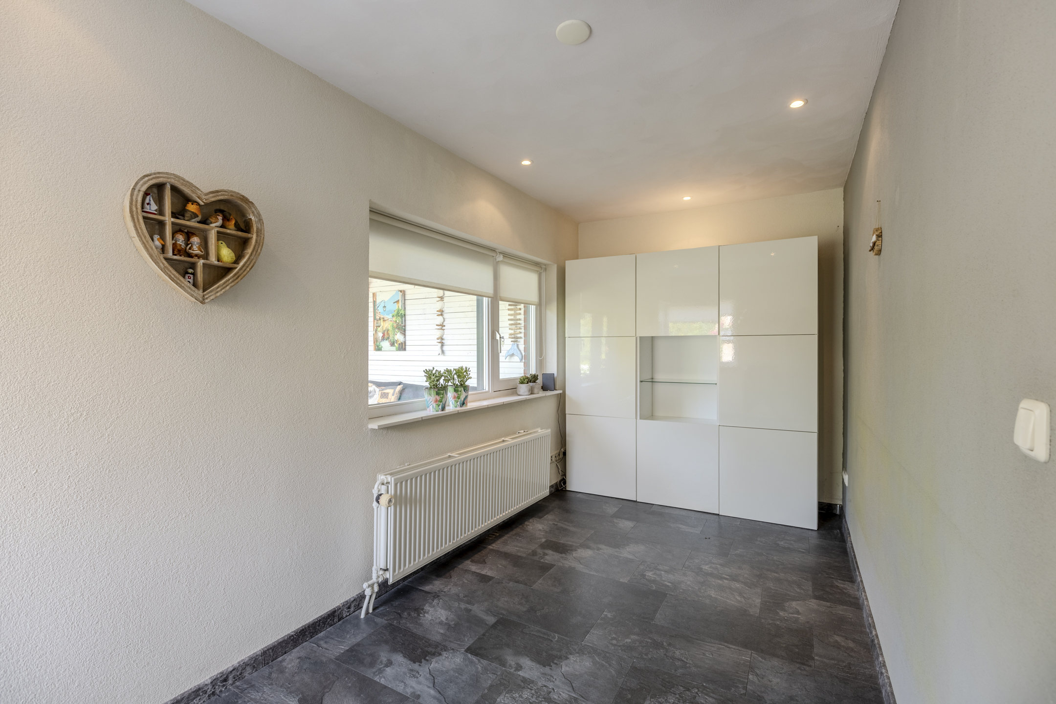 Werk-/ speel-/ slaapkamer circa 10m² met laminaatvloer, spachtelputz wandafwerking en schuurwerk plafondafwerking met inbouwspots. Deze ruimte geeft zicht op de achtertuin.