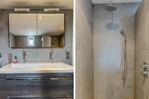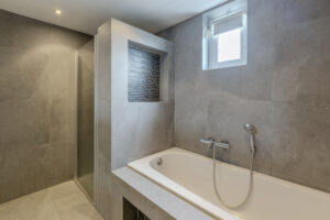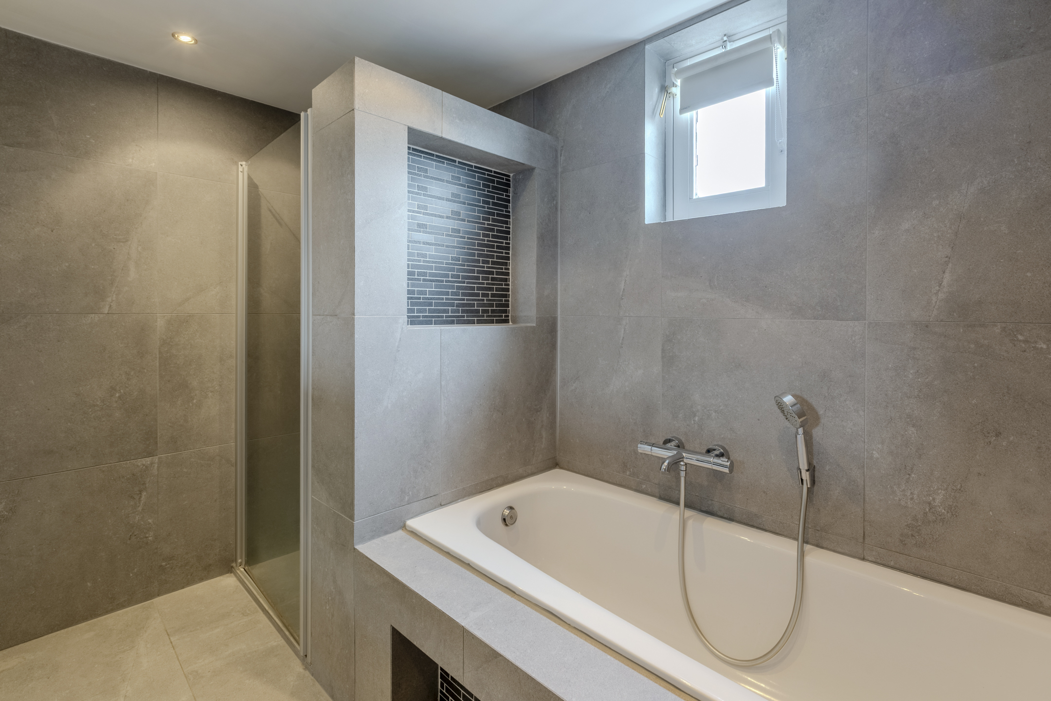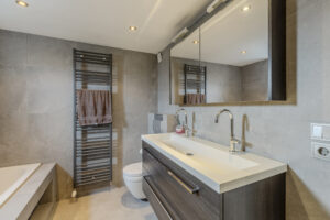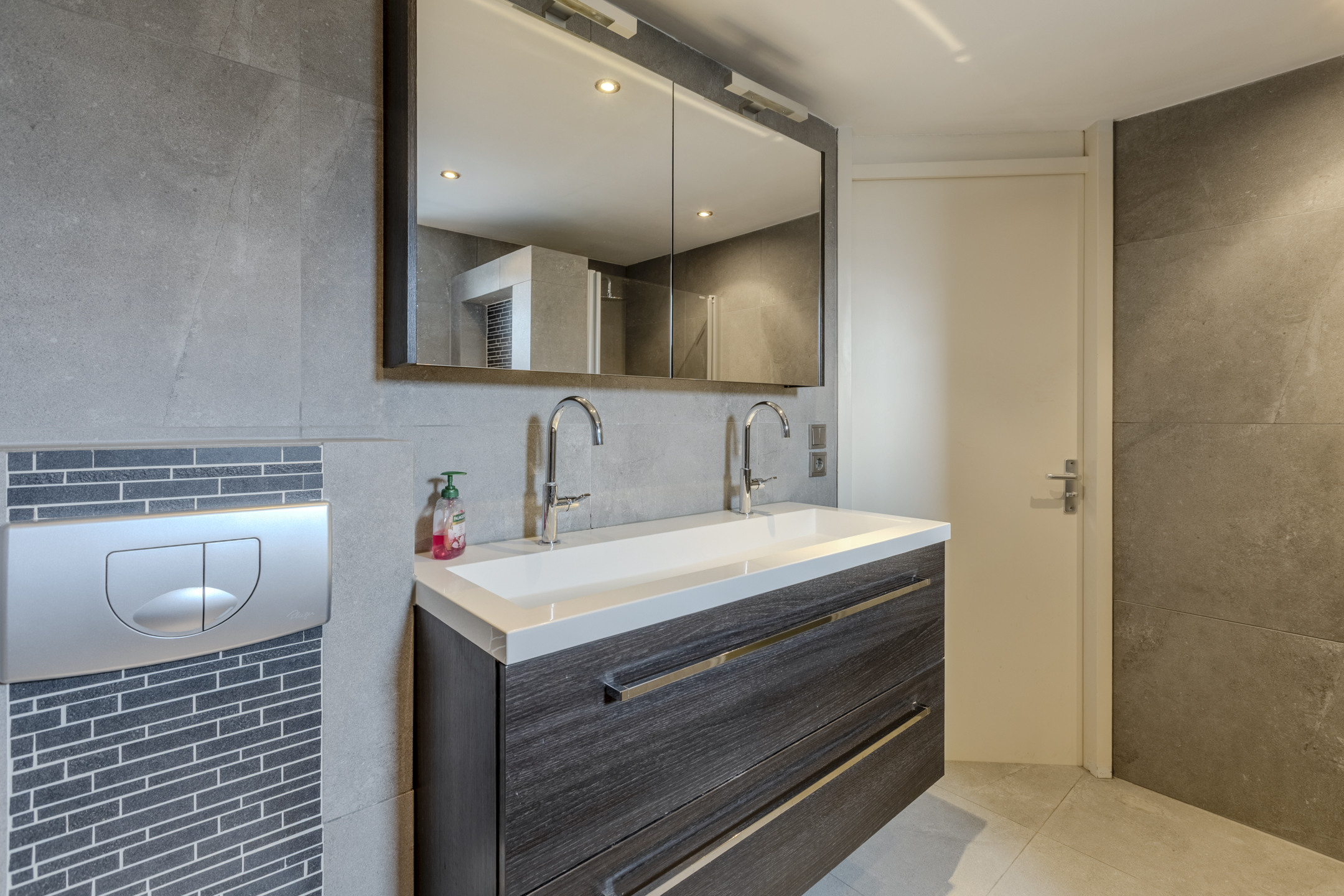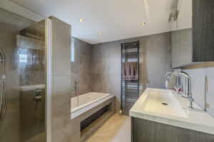 Moderne en luxe badkamer voorzien van een dubbele vaste wastafel met meubel en spiegelkast, ligbad met thermostaat kraan, inloopdouche met regendouche en inbouwkranen, vrij hangend toilet en een design radiator. De badkamer is daarnaast voorzien van strak stucwerk plafondafwerking met inbouwspots.
