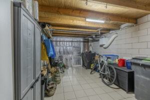 Inpandig bereikbare garage met tegelvloer en een kantel- en loopdeur naar de oprit.