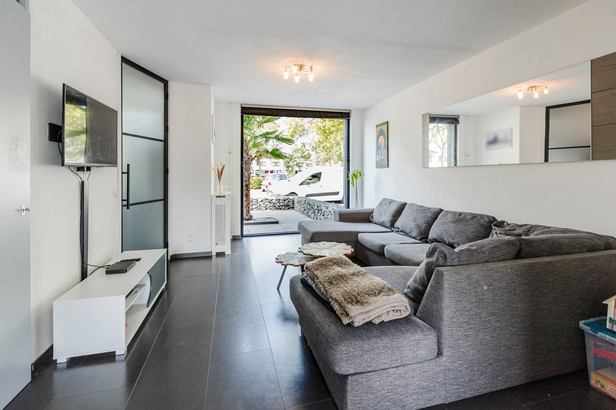 Een zwarte, aluminium deur met glas geeft toegang tot de woonkamer.