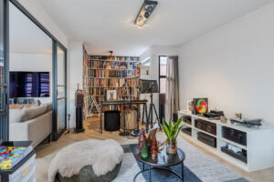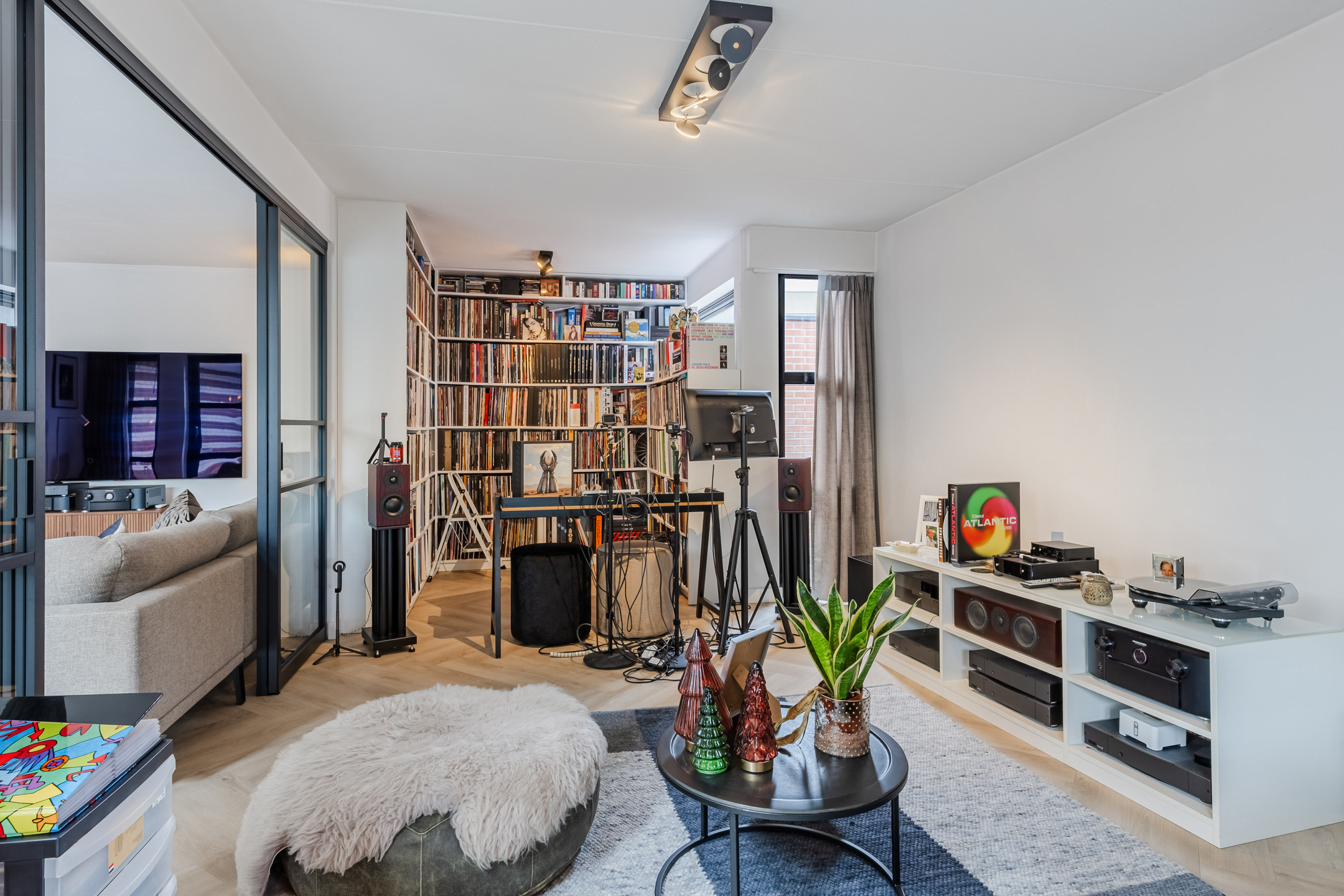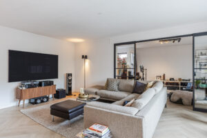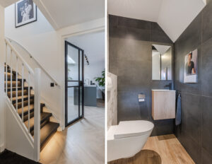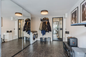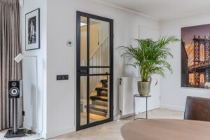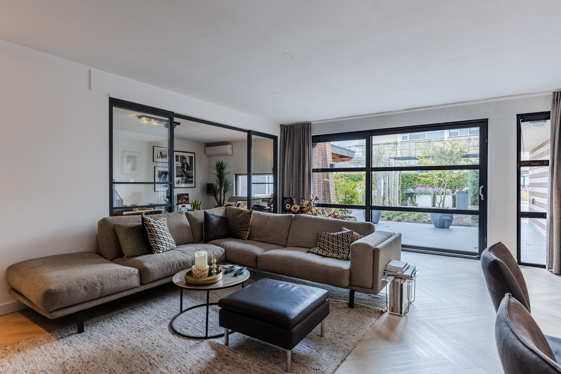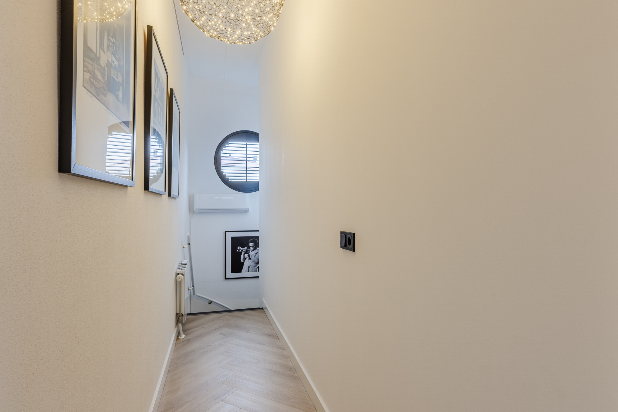 De hal geeft middels twee zwarte stalen deuren met glas toegang tot de woonkamer en een multifunctionele ruimte.