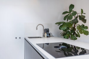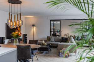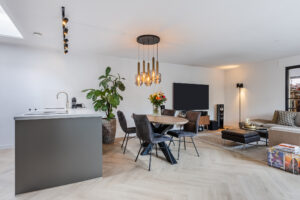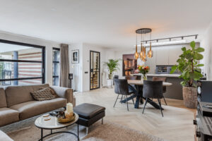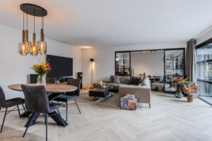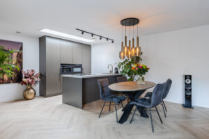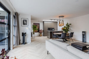 Strak afgewerkte en tuingerichte woonkamer circa 45 m² (inclusief keuken) met visgraat PVC vloer voorzien van vloerverwarming, strak stucwerk wand- en plafondafwerking en een praktische trapkast. De vele raampartijen geven een fraai zicht op de tuin en een schuifpui geeft toegang tot de tuin.
