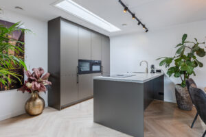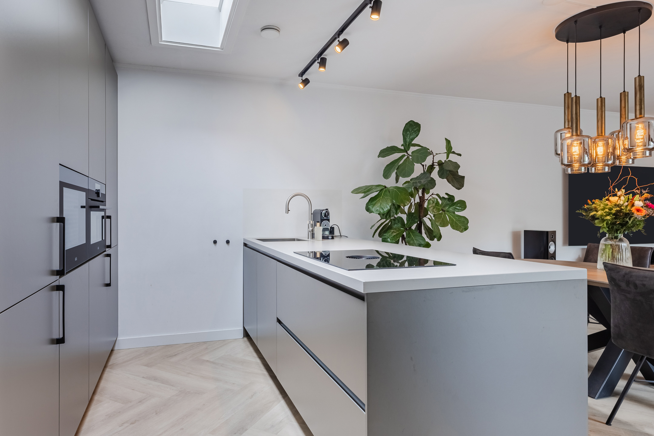 Open keuken met een luxe en moderne keukeninrichting bestaande uit een groot eiland met wandmeubel. De keukeninrichting is voorzien van een composiet blad, quooker, inductie kookplaat met geïntegreerde afzuiging (BORA), koel-/ vriescombinatie, wijnkoeler, combi magnetron en een vaatwasser. De overige inbouwapparatuur is van het merk AEG.