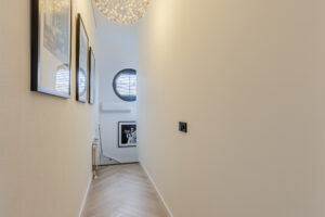 Overloop met visgraat PVC vloer, stucwerk wandafwerking en een airco. Het ronde raam met shutters geeft een speels effect. De overloop geeft toegang tot een slaapkamer.