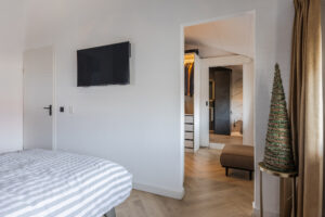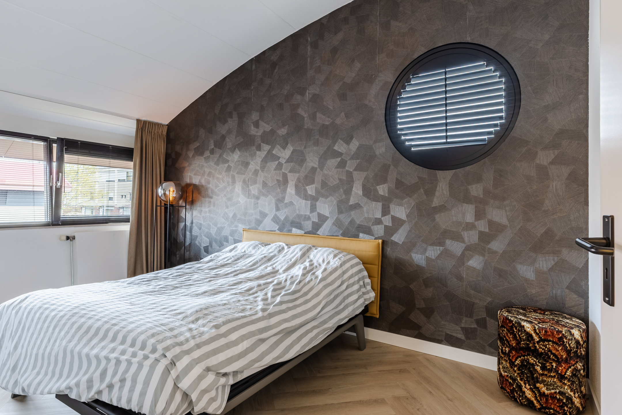 Ruime slaapkamer circa 21 m² met visgraat PVC vloer en stucwerk wandafwerking.