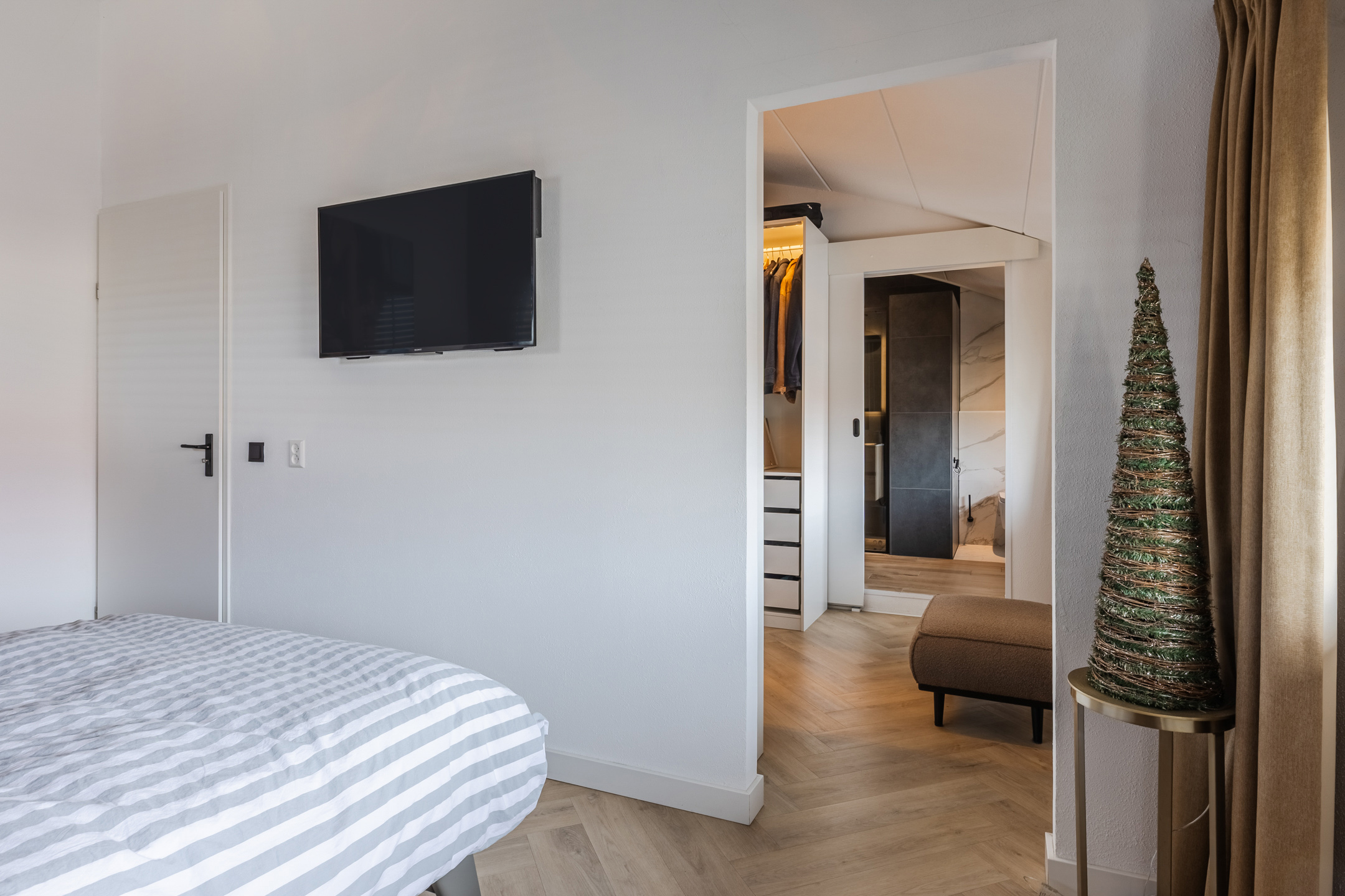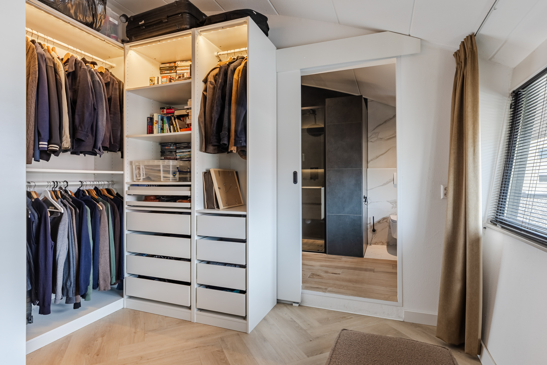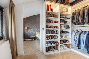 Inloopgarderobe met visgraat PVC vloer en stucwerk wandafwerking.