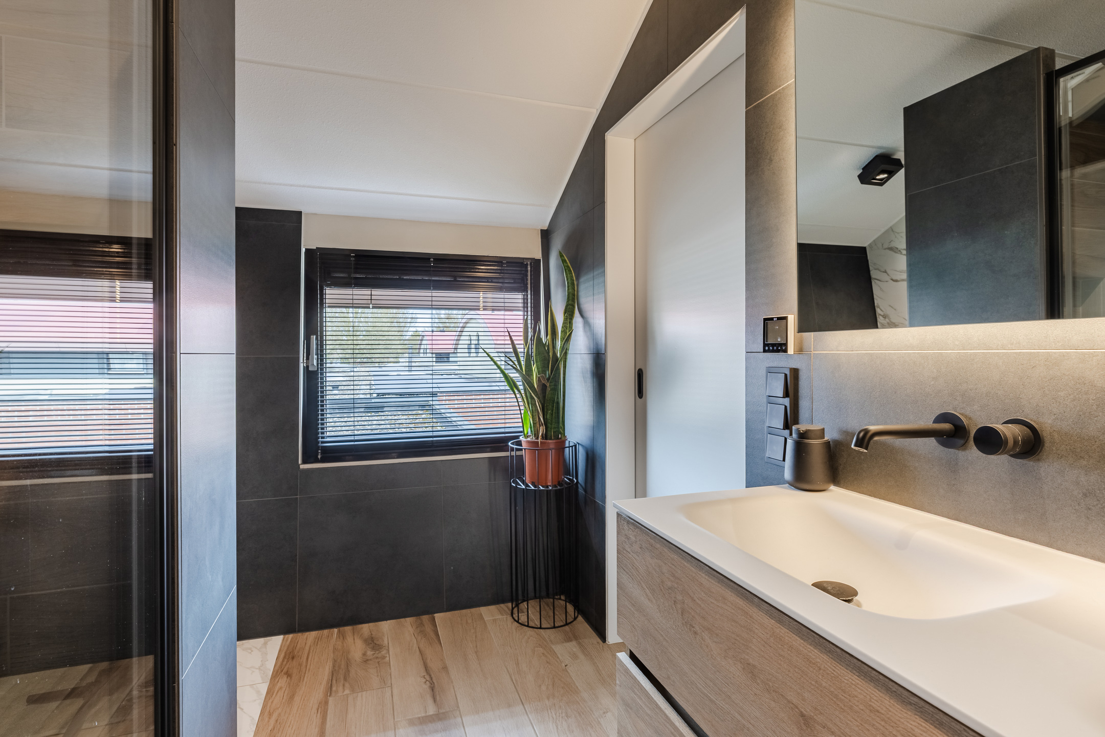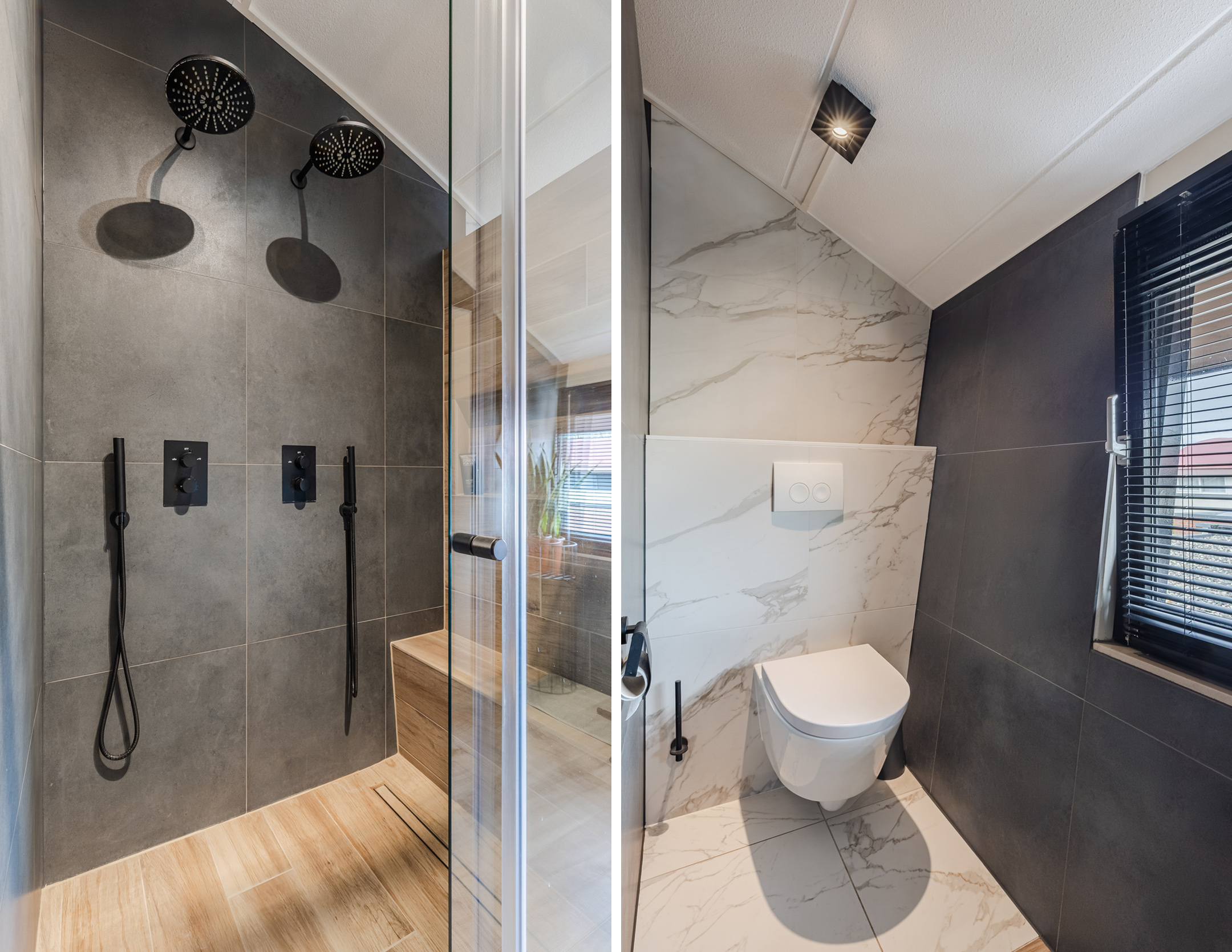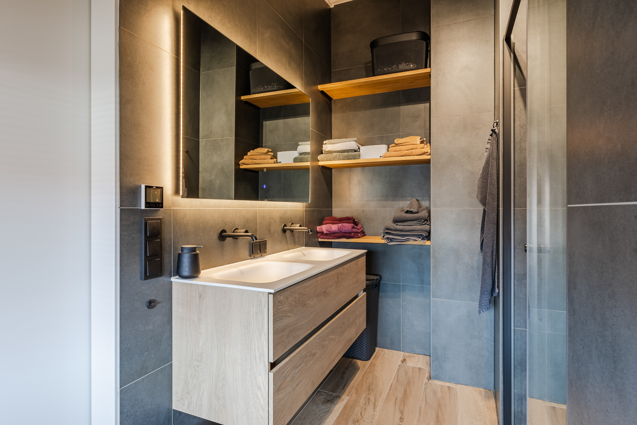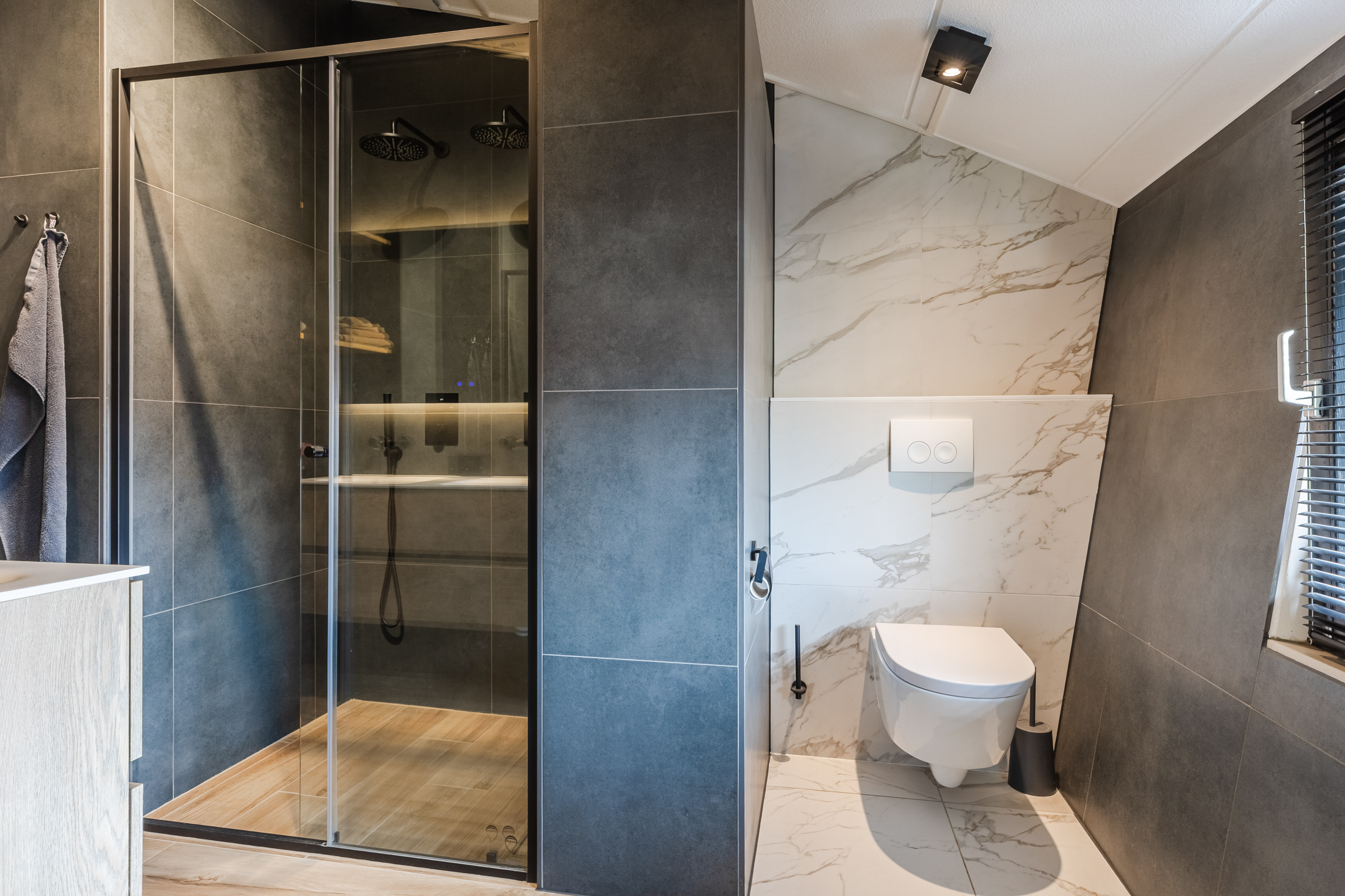 Luxe badkamer voorzien van een dubbele vaste wastafel met meubel, twee persoons inloopdouche met een dubbele regendouche en inbouwkranen en een vrij hangend toilet. De badkamer is daarnaast voorzien van elektrische vloerverwarming.