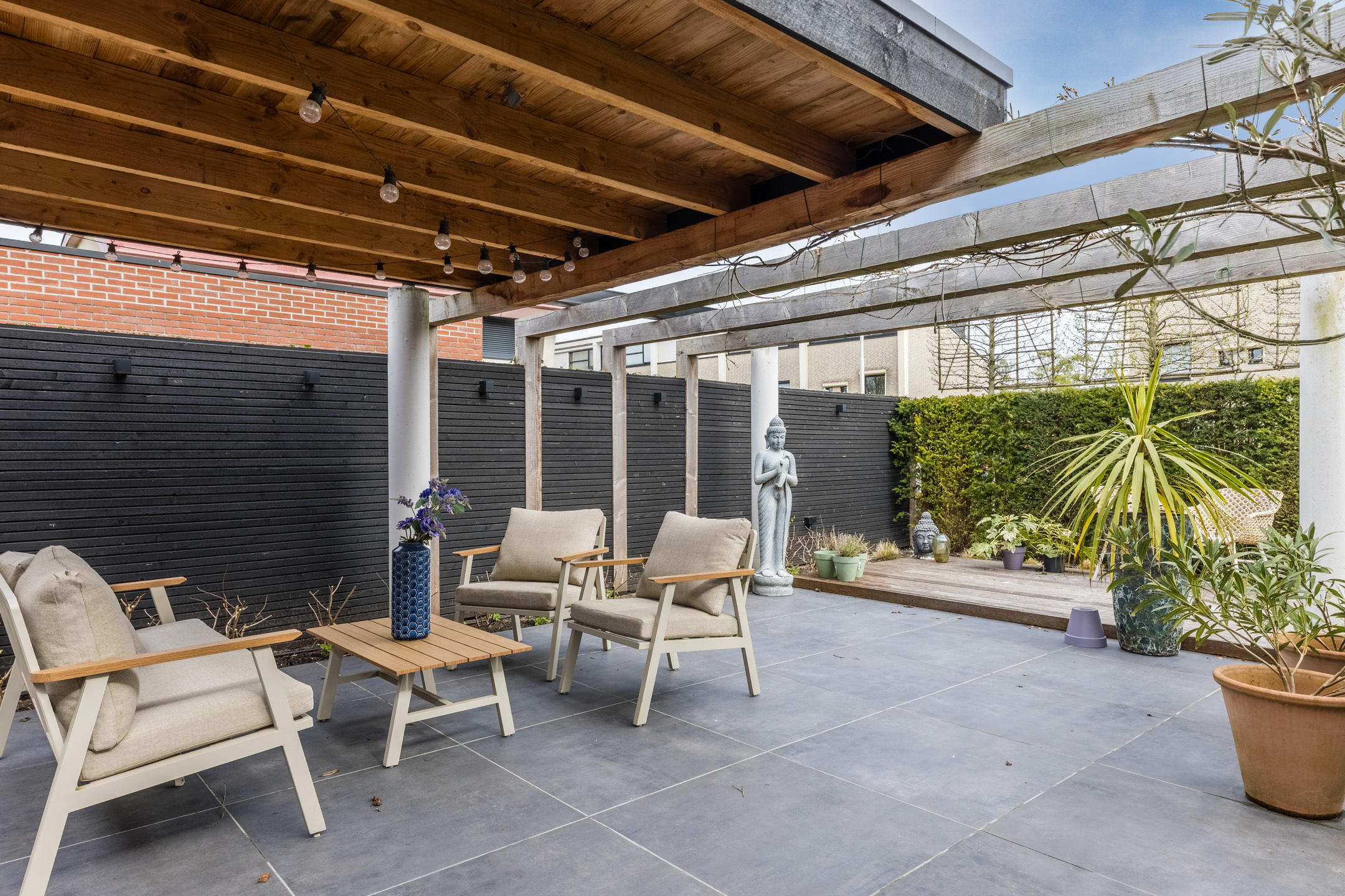 De fraai aangelegde en privacy biedende tuin heeft een gezellige overkapping, meerdere terrassen, diverse prachtige borders en een achterom. Hier kunt u heerlijk vertoeven!