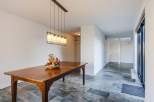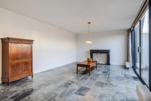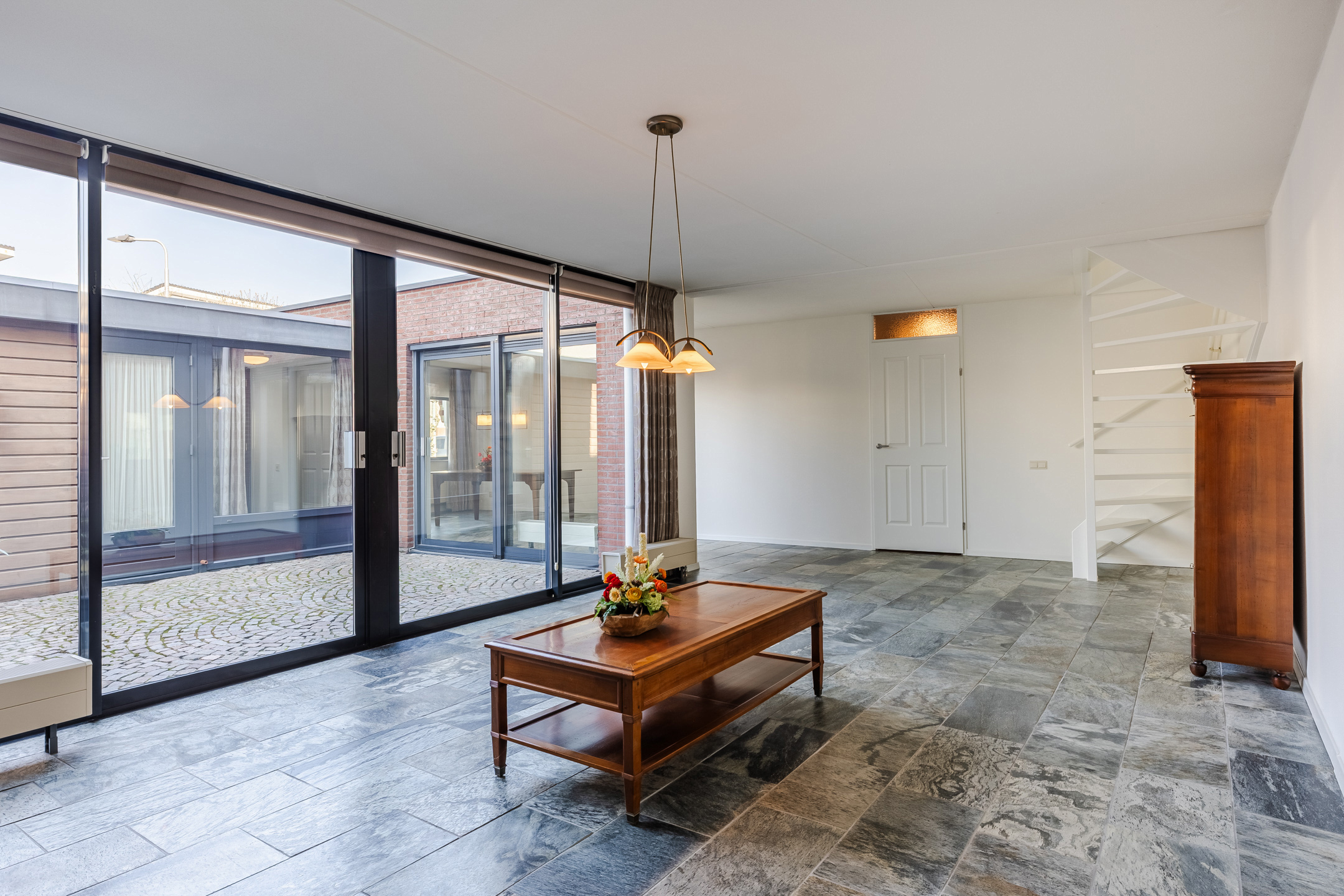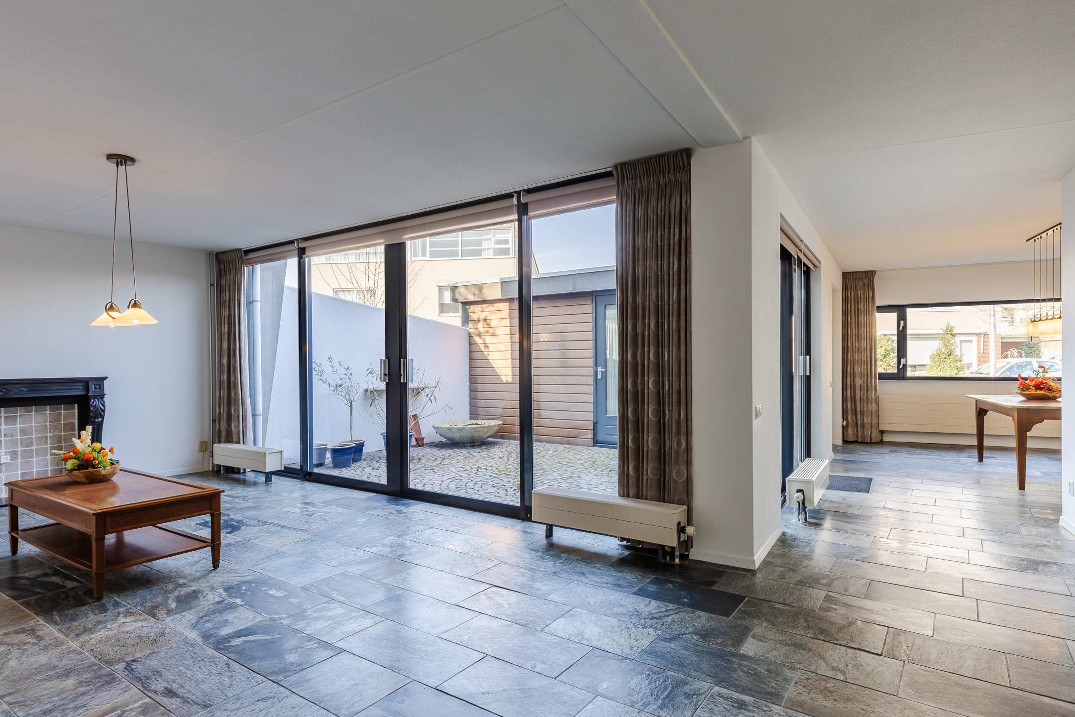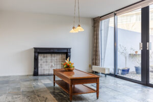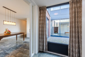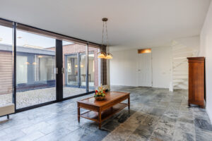 Via een doorloop met schuifpui bereikt u het sfeervolle zitgedeelte aan de achterzijde. Grote raampartijen en een dubbele schuifpui zorgen hier voor een prachtige verbinding met de patio en een overvloed aan daglicht.