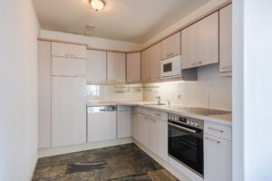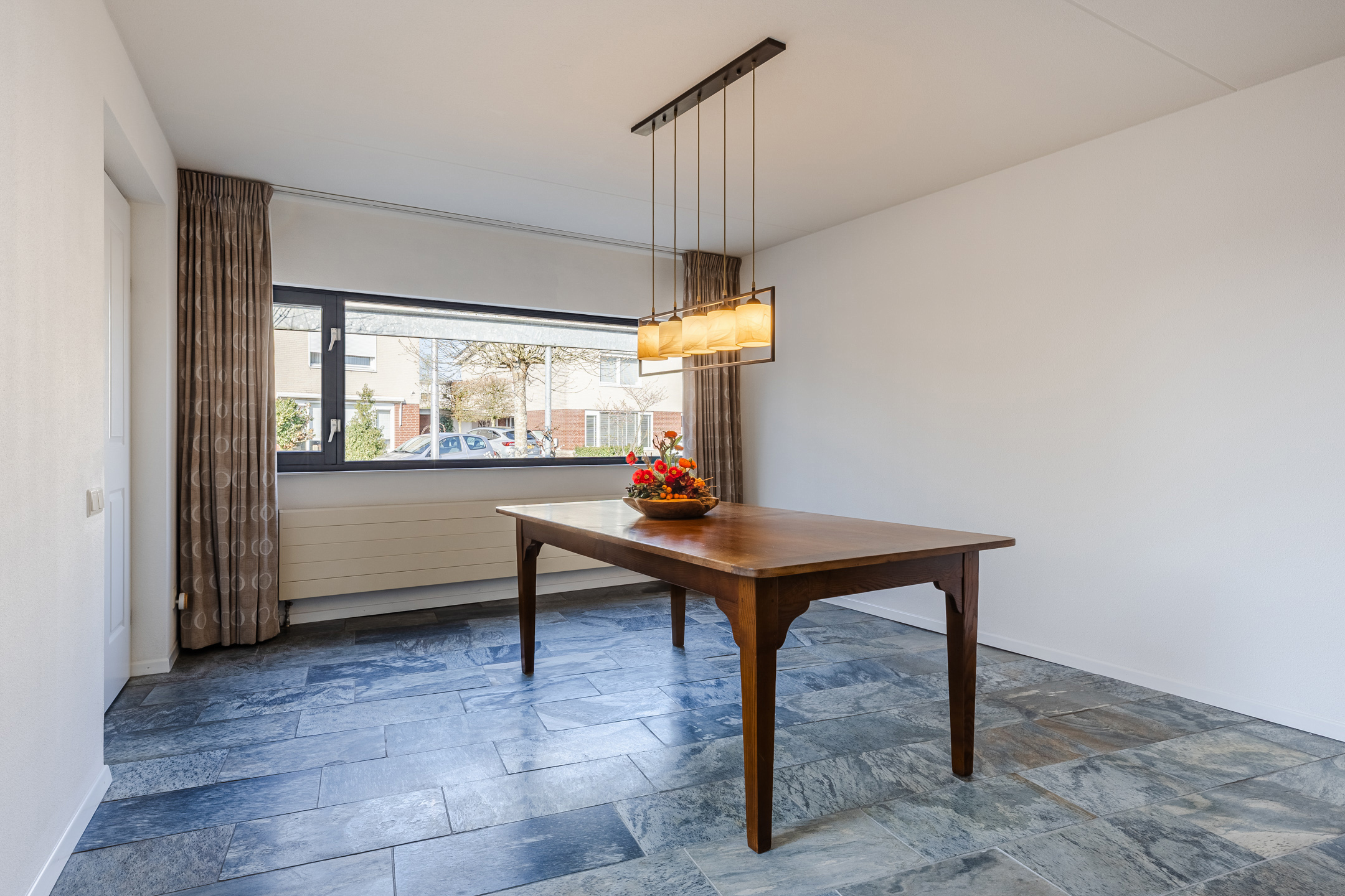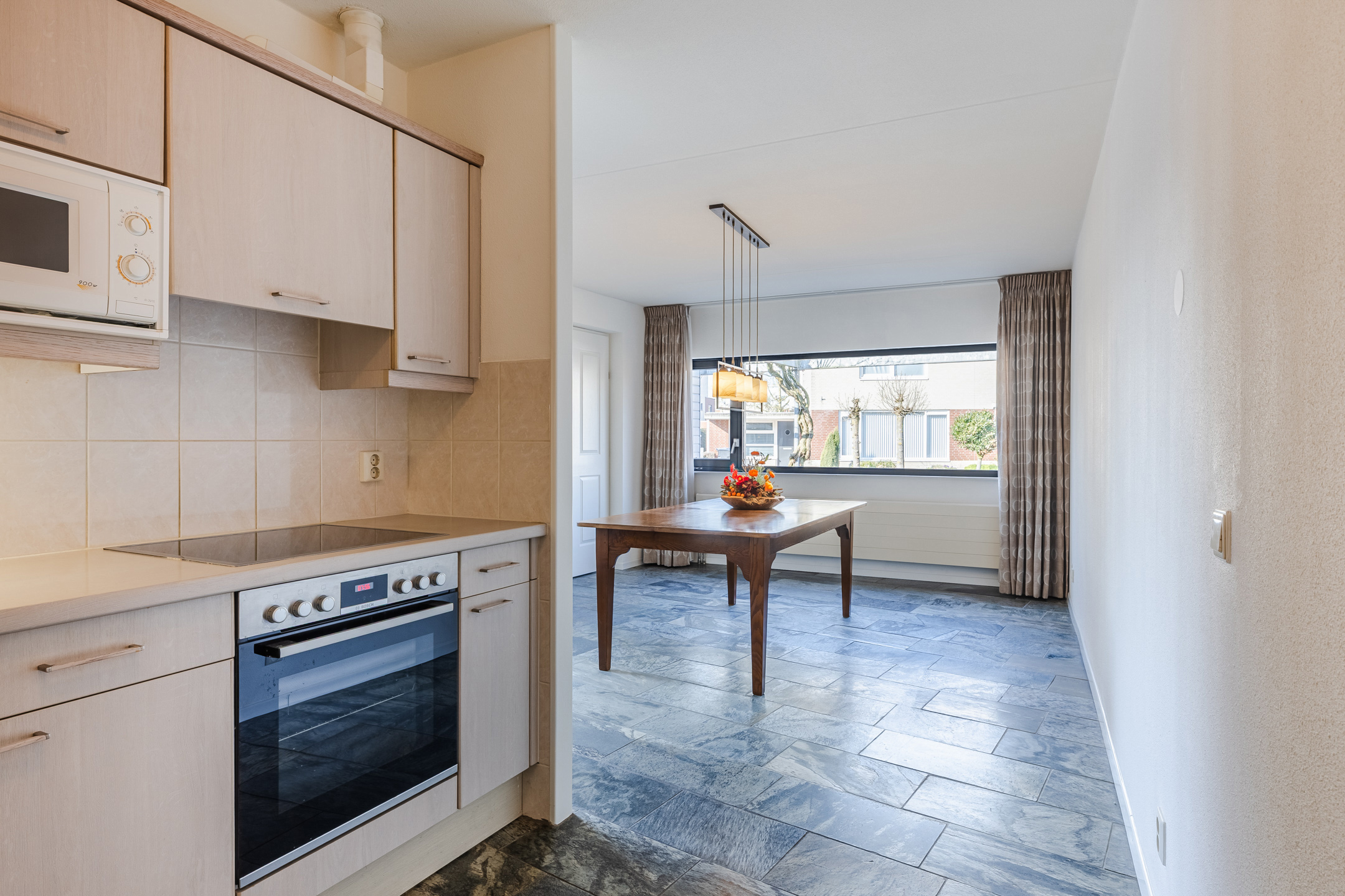 De speels ingedeelde en lichte woonkamer vormt het hart van de woning en staat in open verbinding met de semi-open keuken. Aan de voorzijde bevindt zich het eetgedeelte met aansluitend de keuken in praktische hoekopstelling, voorzien van moderne inbouwapparatuur, waaronder een inductiekookplaat (2022), oven (2022), magnetron, vaatwasser en koelkast met vriesvak.