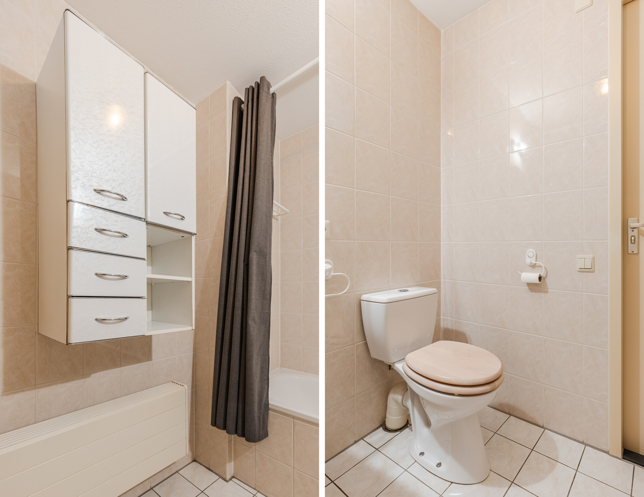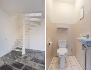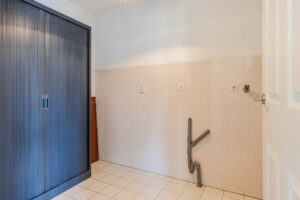 Aangrenzend vindt u een praktische bijkeuken met aansluitingen voor wasapparatuur en extra bergruimte. Tevens is er een gedeeltelijk betegeld toilet met fontein aanwezig.
