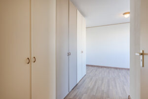 De overloop met laminaatvloer en praktische vaste kast biedt toegang tot drie slaapkamers en de badkamer.