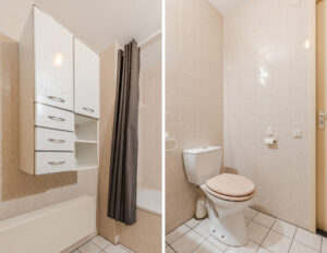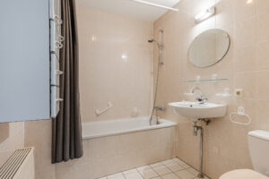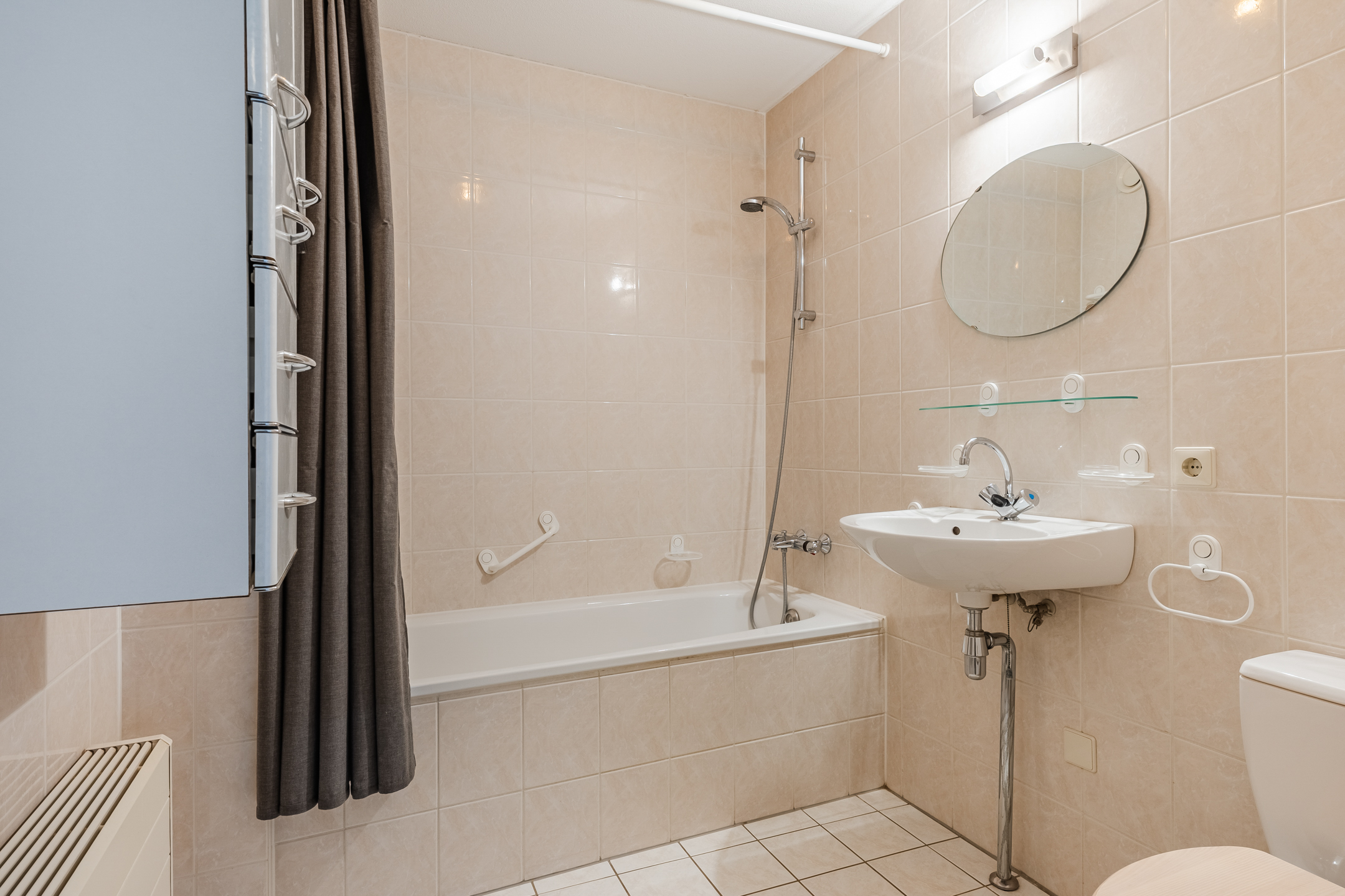 De badkamer is licht betegeld en compleet uitgerust met een ligbad met douchefunctie, wastafel en een tweede toilet.