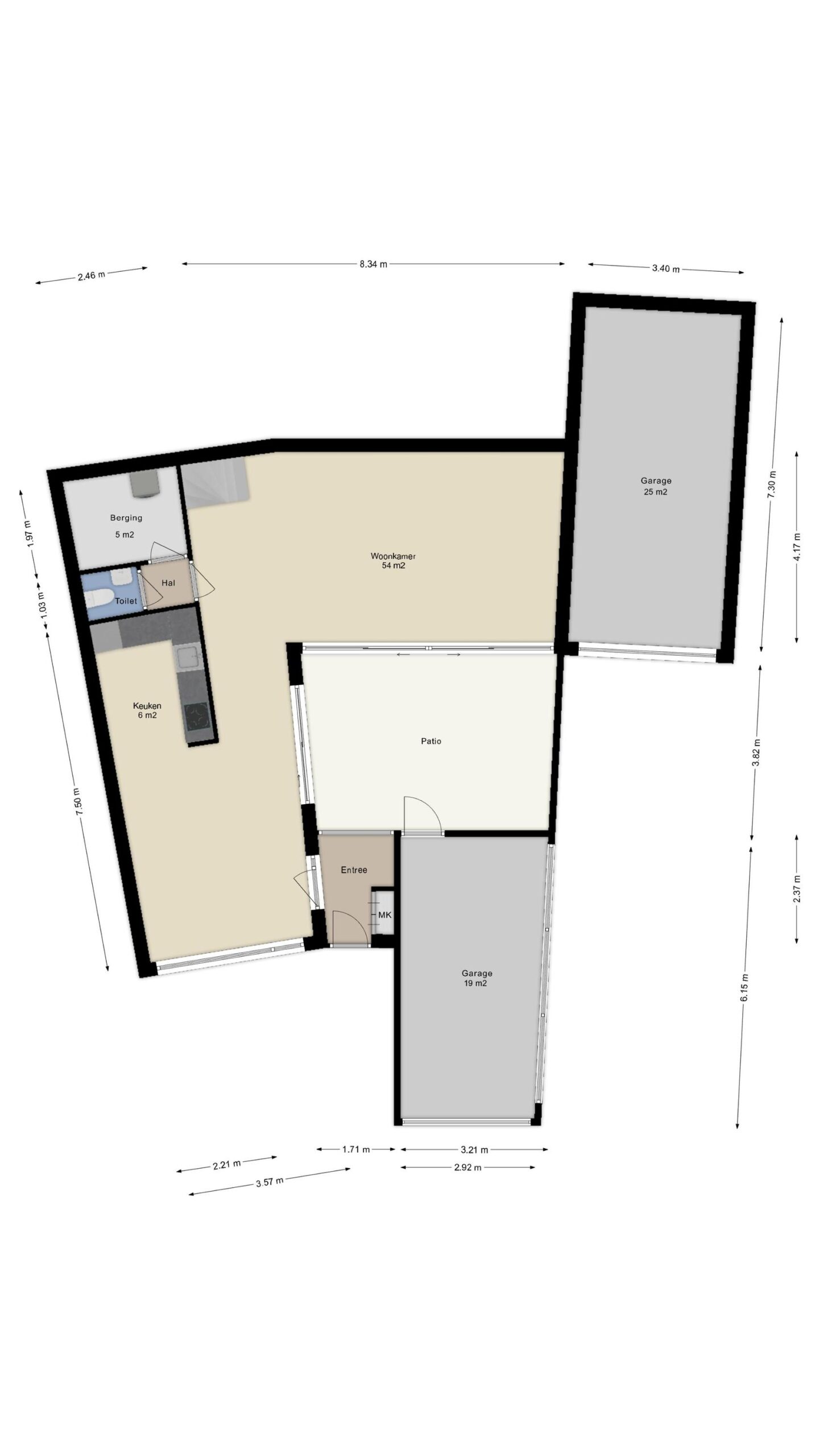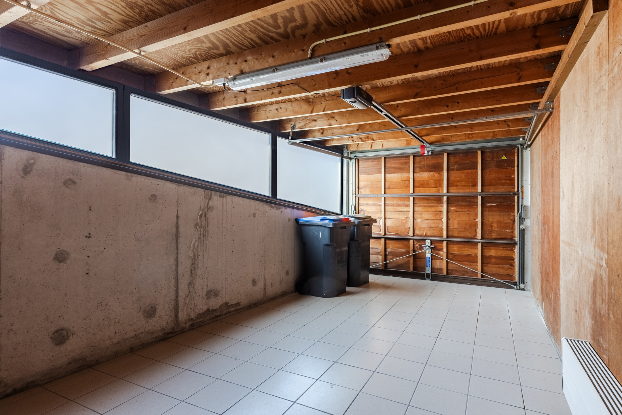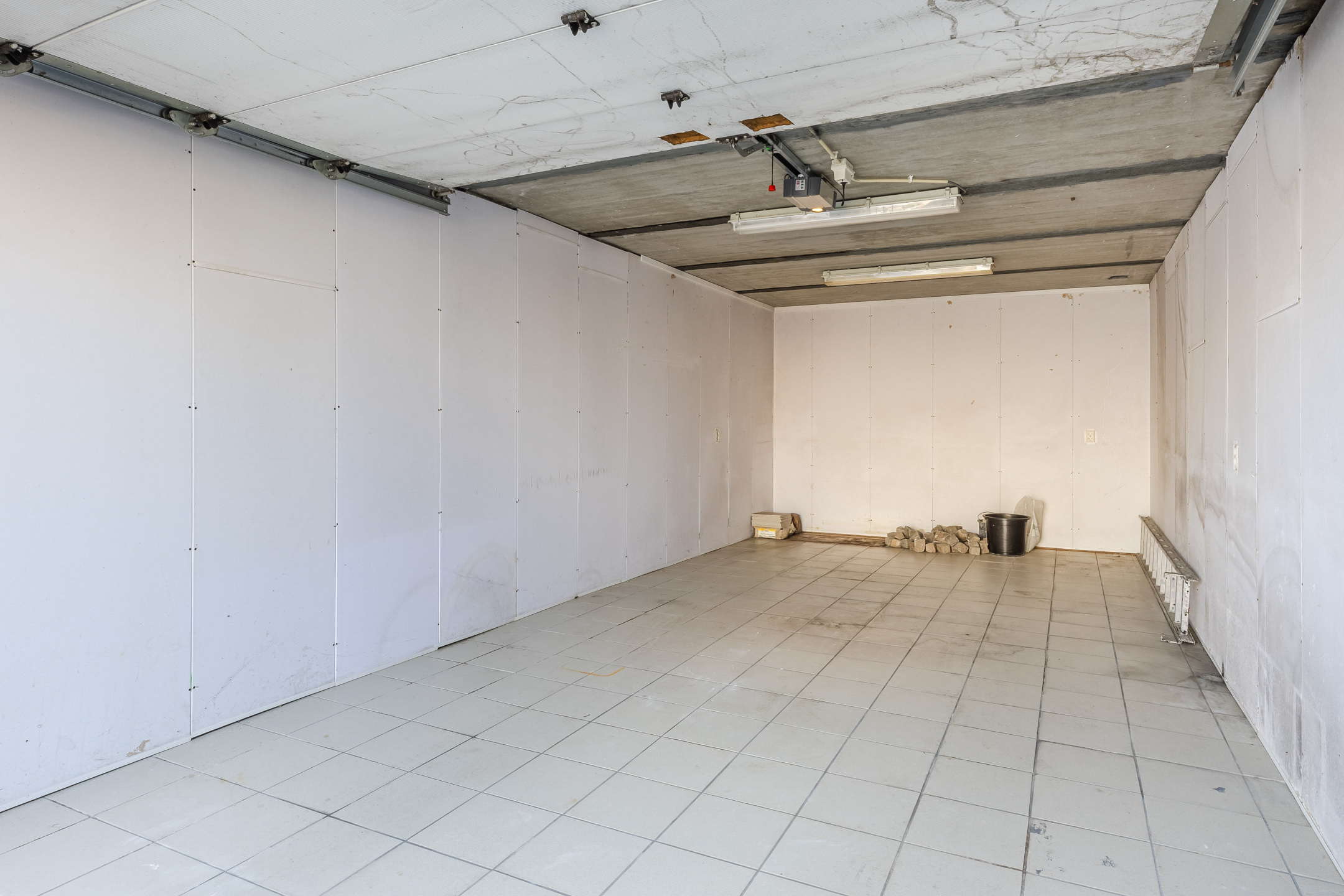 Vanuit de patio bereikt u de eerste garage, voorzien van verwarming, tegelvloer, elektra en een elektrisch bedienbare deur. Dankzij de aanwezige wateraansluiting en stopcontacten is deze ruimte bijzonder veelzijdig.