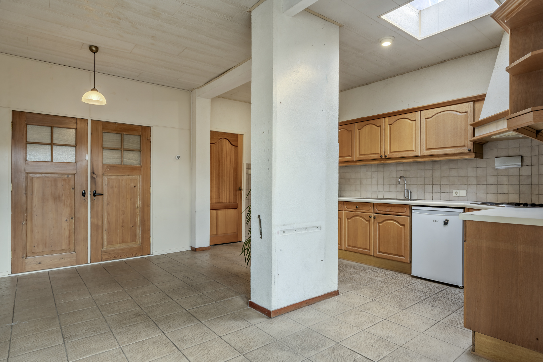Aan de achterzijde van de woning gelegen woonkamer circa 26m² (inclusief keuken) met tegelvloer.
