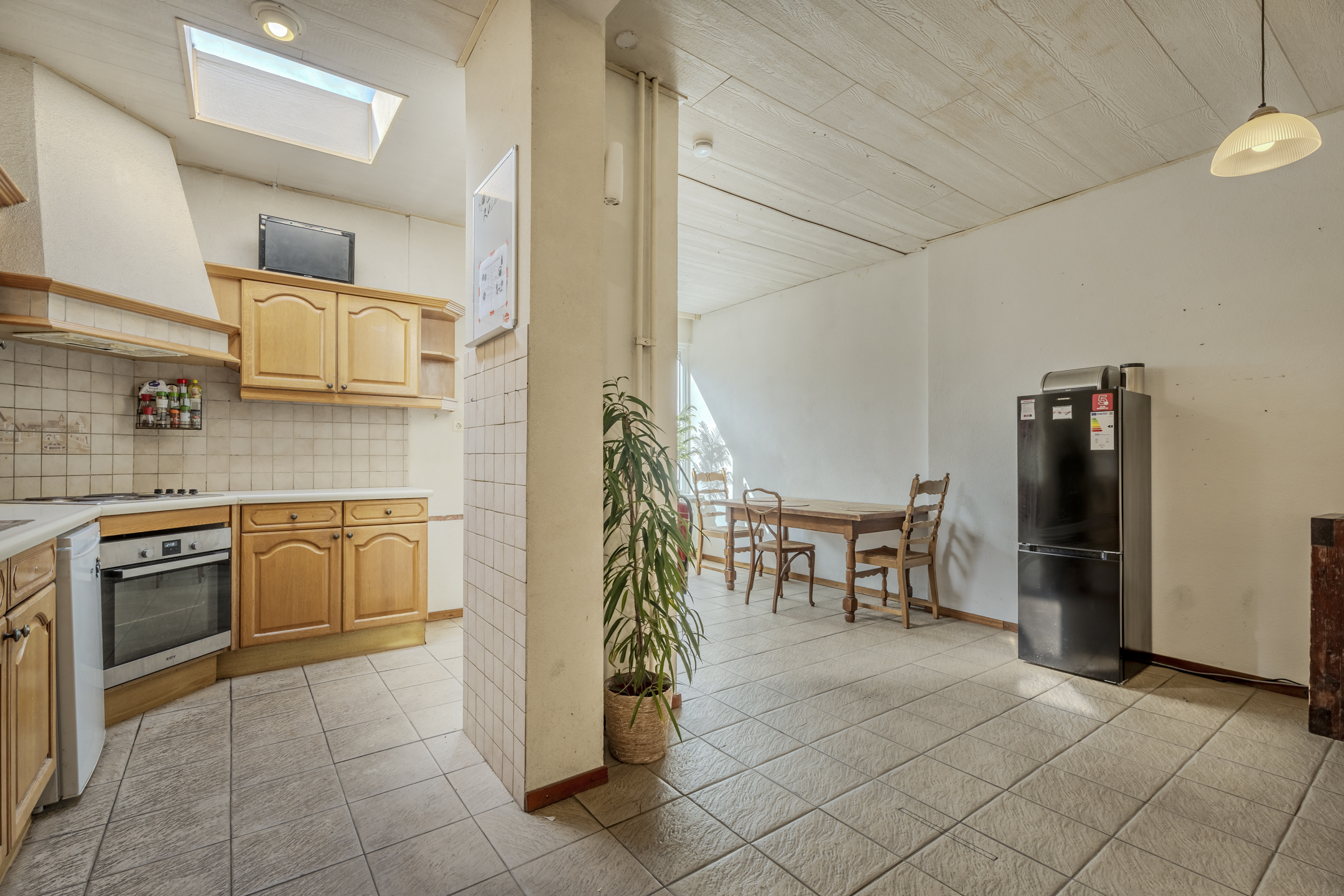 De woonkamer is op dit moment gesplitst met aan de voorzijde een werk-/ slaapkamer circa 16m². Als deze ruimte bij de woonkamer met open keuken wordt betrokken dan ontstaat er een totale leefruimte van maar liefst circa 42m².