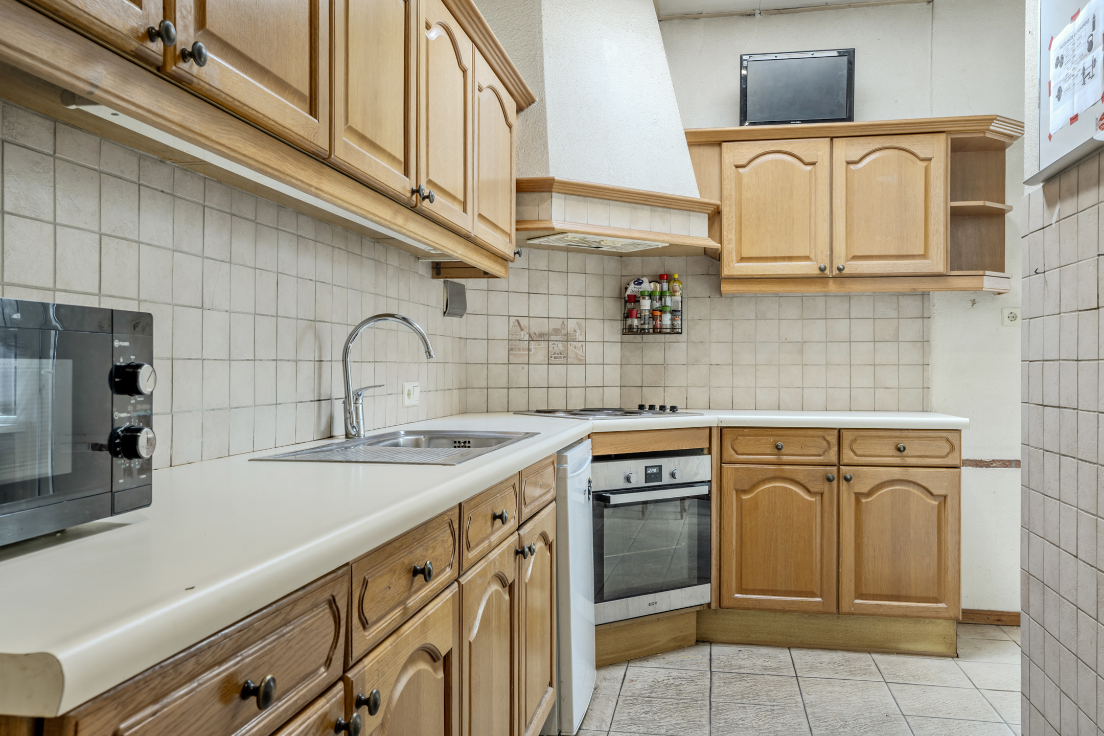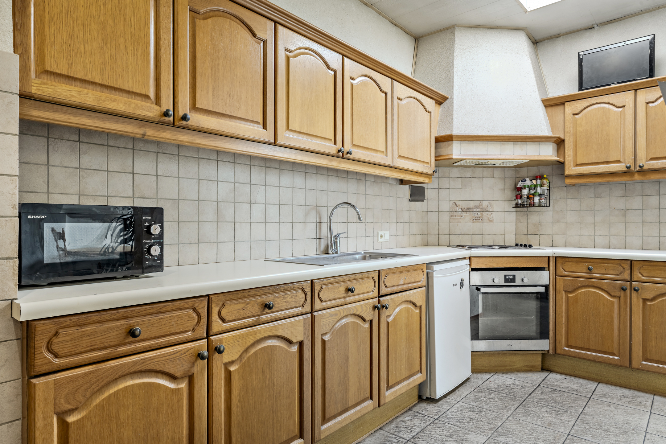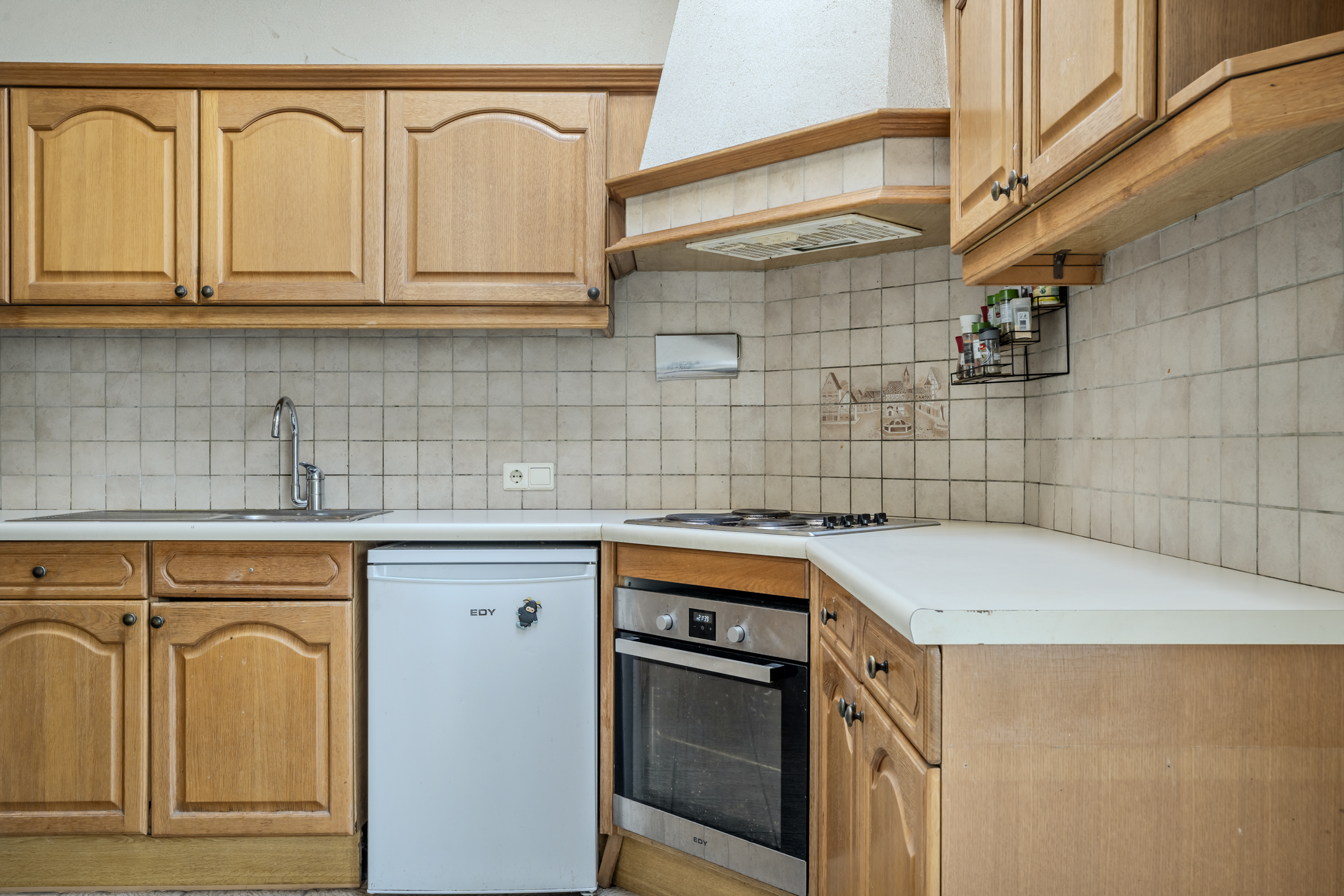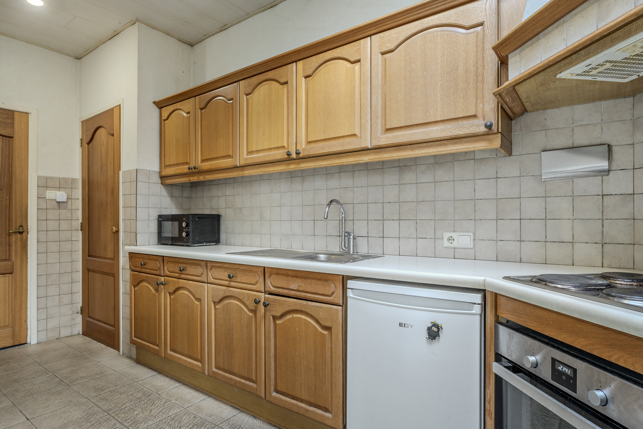 Open keuken met tegelvoer en een nette, doch eenvoudige keukeninrichting in hoekopstelling voorzien van een elektrische kookplaat, afzuigschouw en een oven. In de keuken is daarnaast een vaste kast aanwezig.