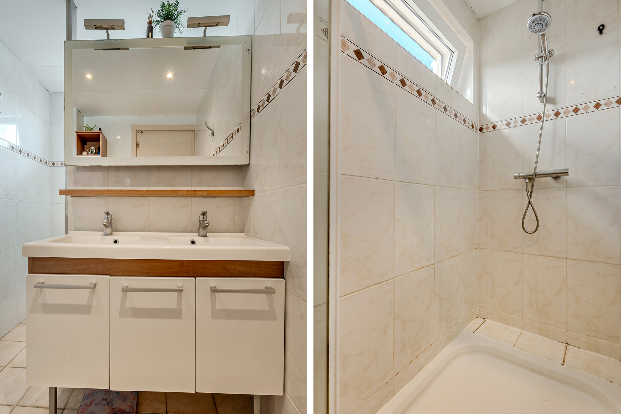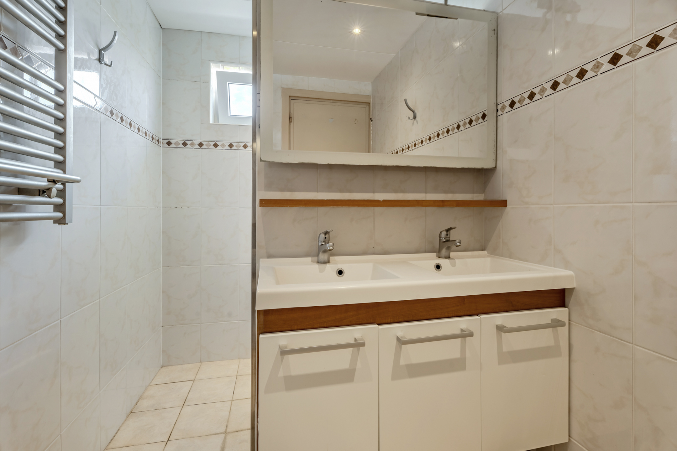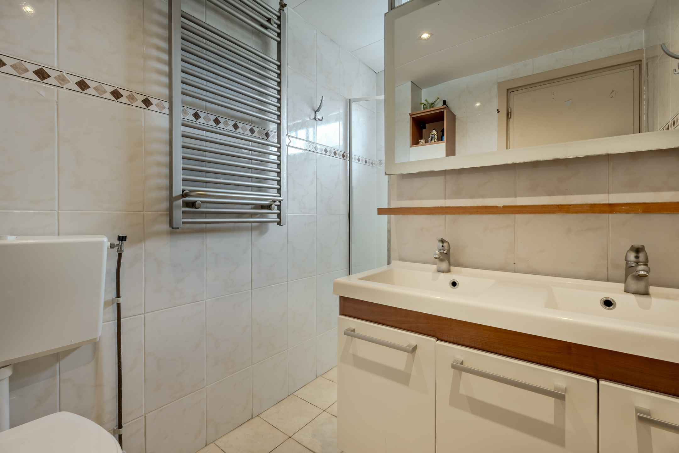 Licht betegelde badkamer voorzien van dubbele vaste wastafel met meubel, douche met thermostaatkraan en een 2e toilet.