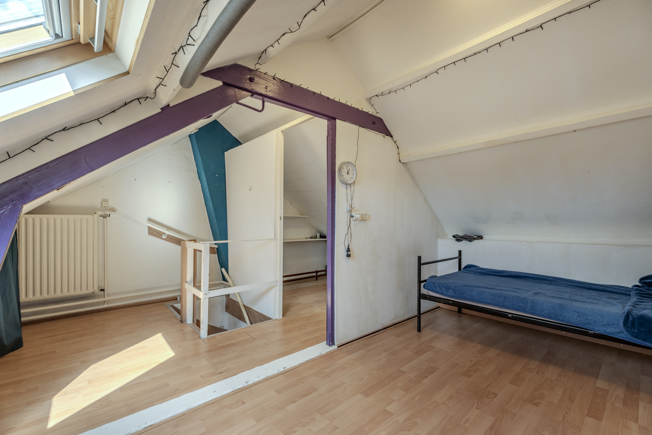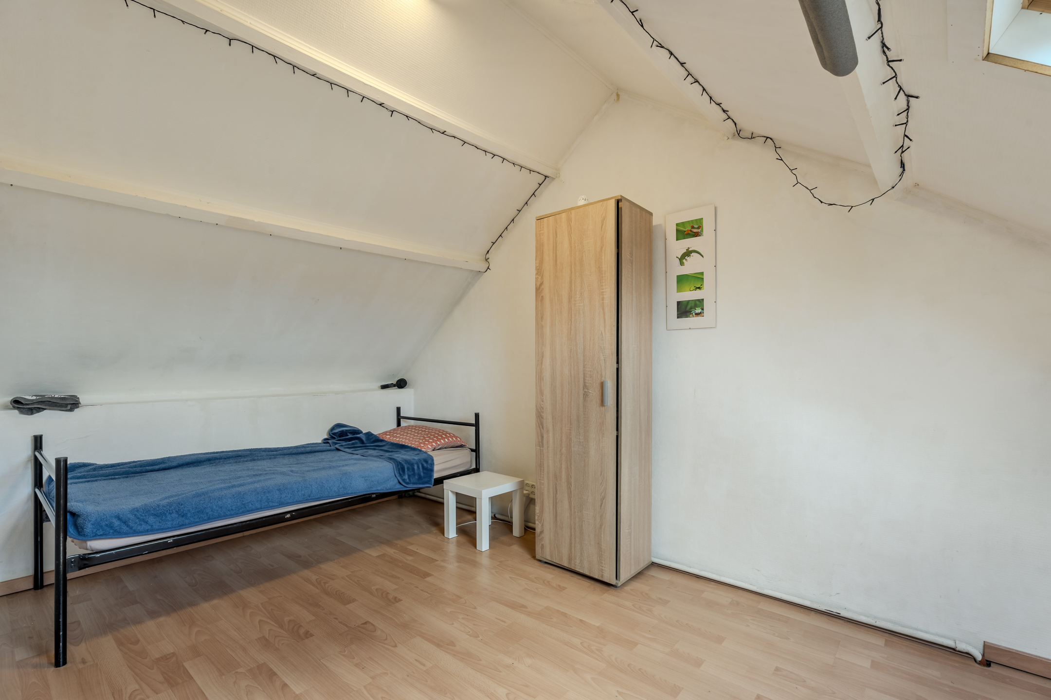 Zolderslaapkamer circa 11m² met laminaatvloer, twee dakramen en bergruimte onder de dakschuinte.