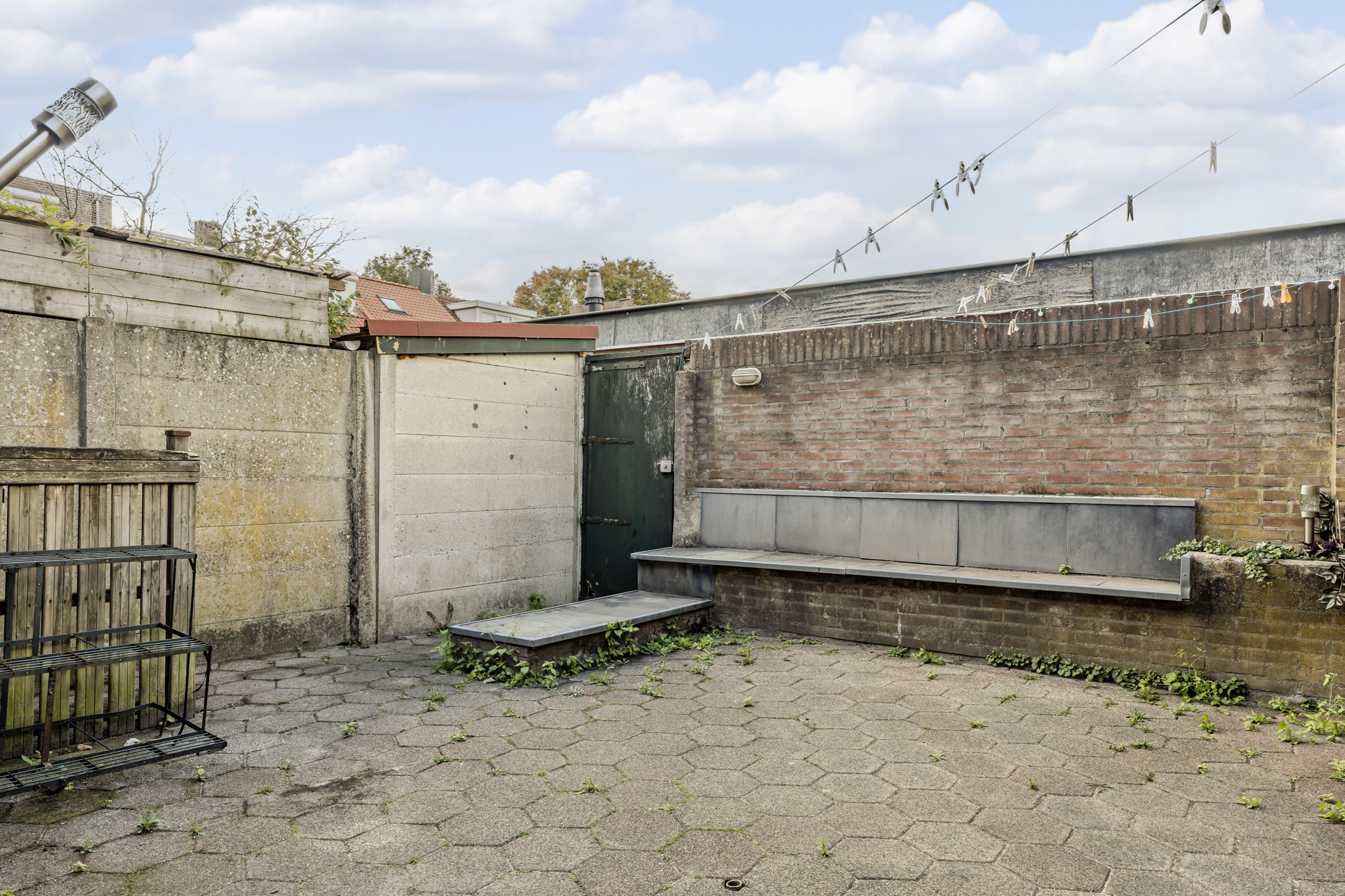 Achtertuin op het zonnige westen. De achtertuin is bestraat, voorzien van een stenen berging, afgesloten overkapping en een achterom. Vanuit de tuin is er tevens toegang tot de garage.