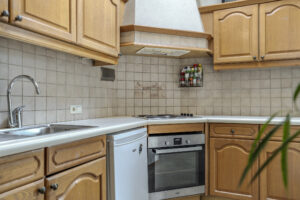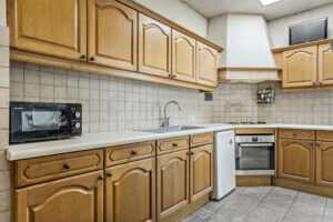 Open keuken met tegelvoer en een nette, doch eenvoudige keukeninrichting in hoekopstelling voorzien van een elektrische kookplaat, afzuigschouw en een oven. In de keuken is daarnaast een vaste kast aanwezig.