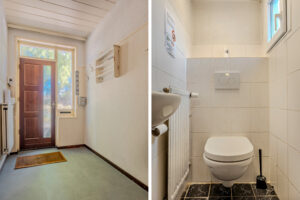 Entree, hal met tegelvloer en een trapkast met meterkast.