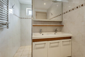 Licht betegelde badkamer voorzien van dubbele vaste wastafel met meubel, douche met thermostaatkraan en een 2e toilet.