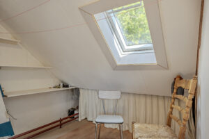 Zolderslaapkamer circa 11m² met laminaatvloer, twee dakramen en bergruimte onder de dakschuinte.