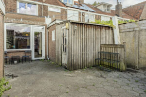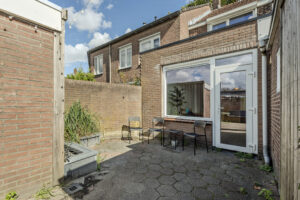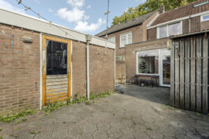 Achtertuin op het zonnige westen. De achtertuin is bestraat, voorzien van een stenen berging, afgesloten overkapping en een achterom. Vanuit de tuin is er tevens toegang tot de garage.