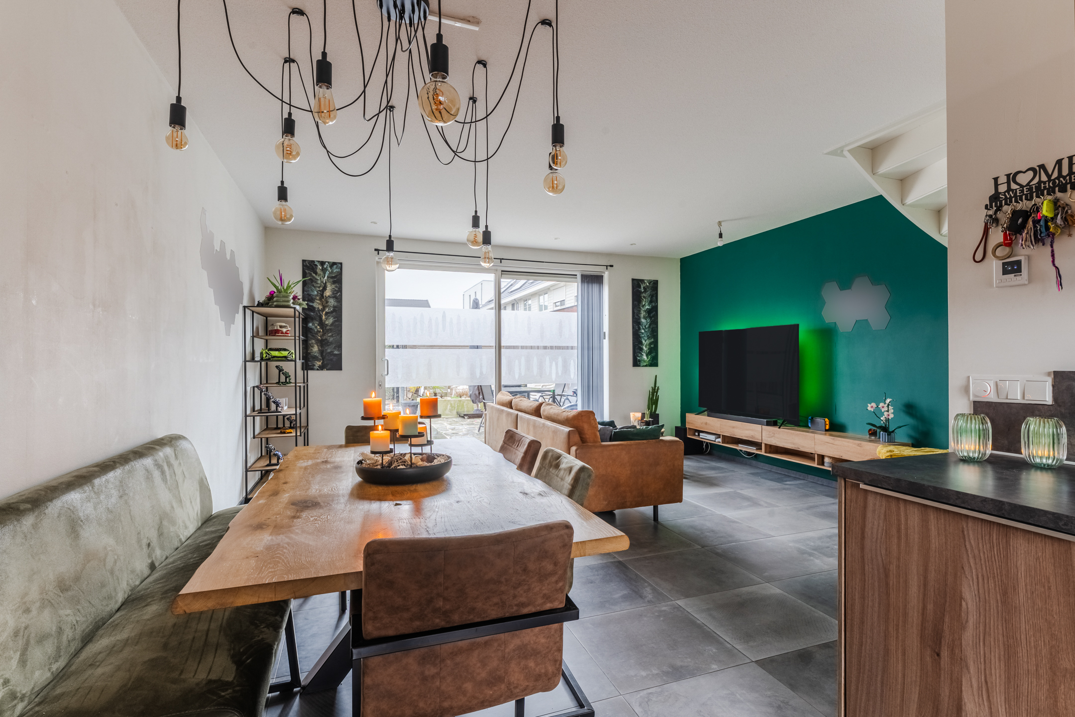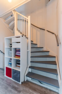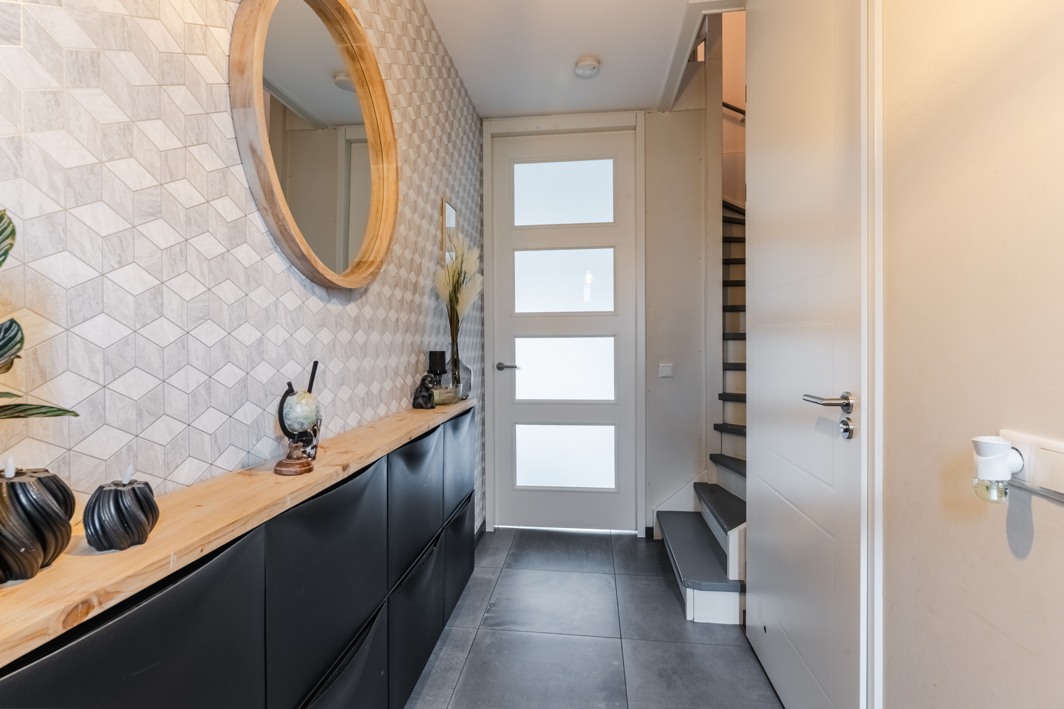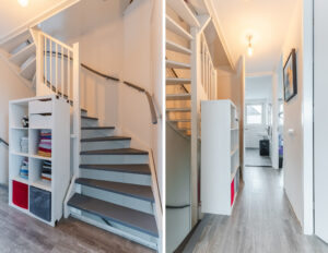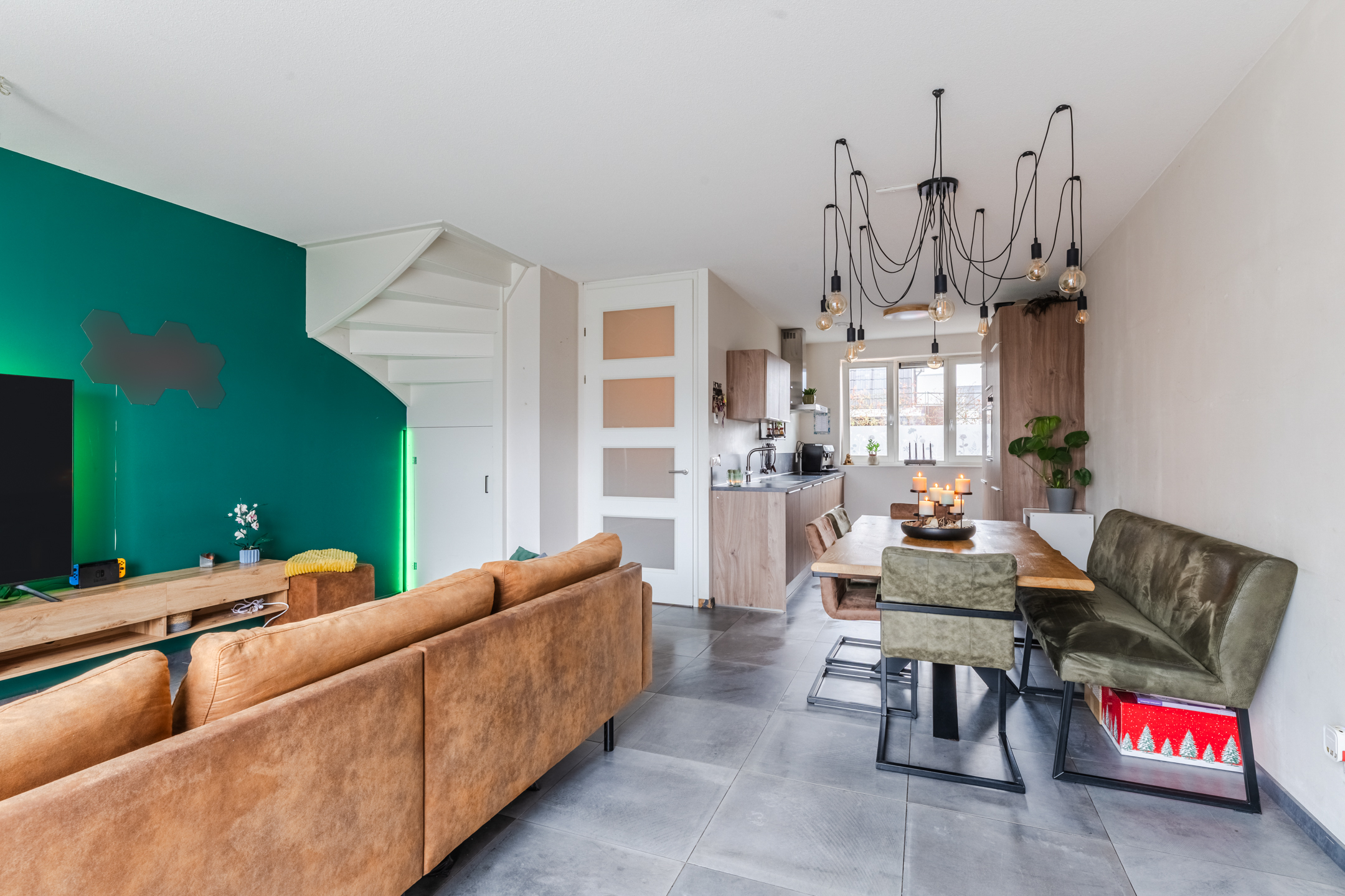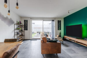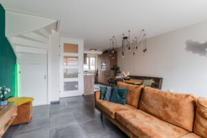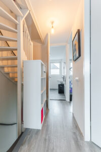 De woonkamer is tuingericht en heeft een prettige lichtinval dankzij de schuifpui naar de achtertuin. Onder de trap bevindt zich een halve trapkast, waarbij nog enkele treden zichtbaar zijn, praktisch voor extra opbergruimte. De begane grond is afgewerkt met een tegelvloer, behang op de wanden en een gestuct plafond.