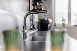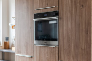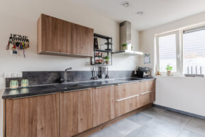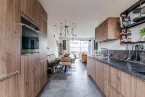 Aan de voorzijde van de woning bindt zich de keuken, die is uitgerust met diverse inbouwapparatuur, waaronder 4 pits inductiekookplaat, met een extra grote kookzone, vaatwasser, recirculatie afzuigkap, grote koelkast, stoomoven en vriezer.