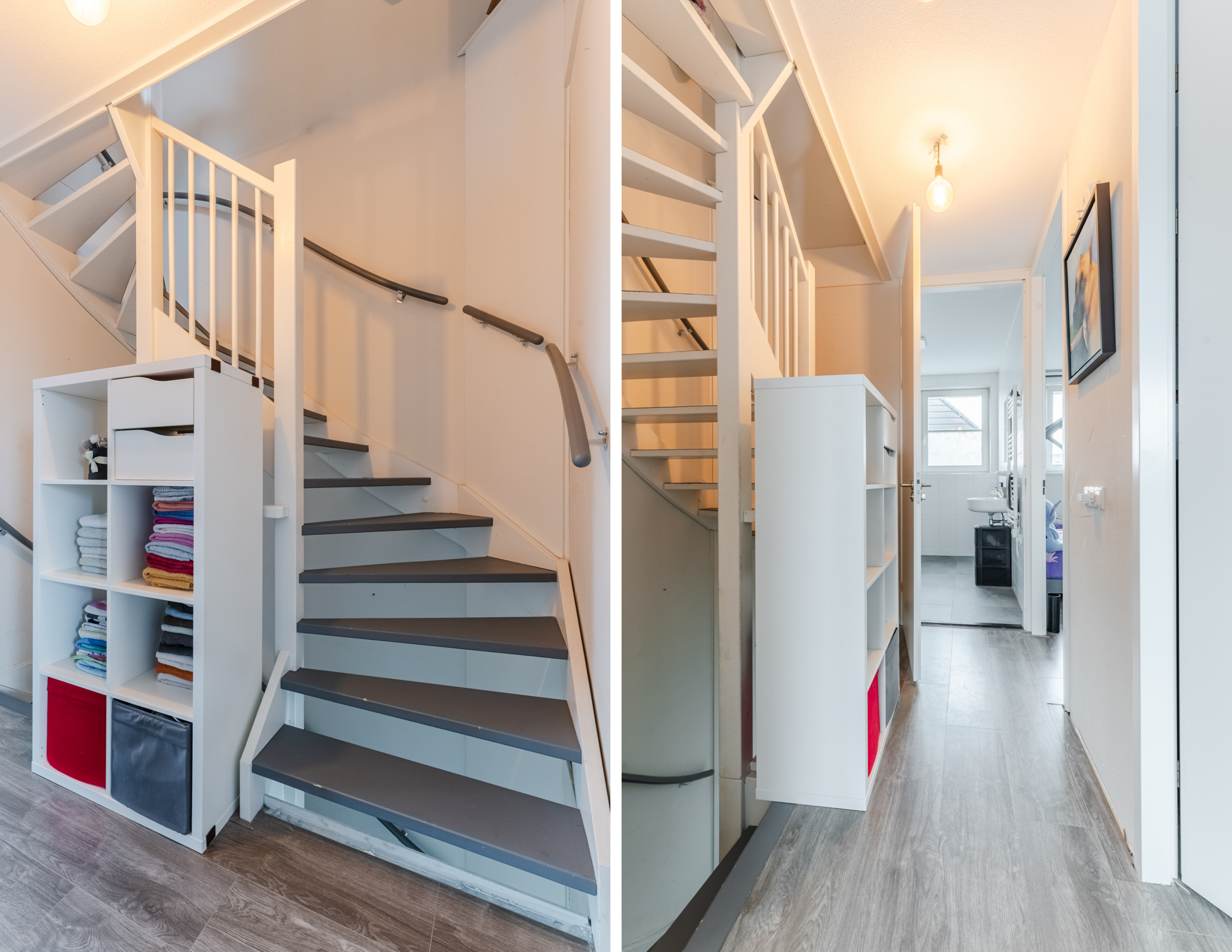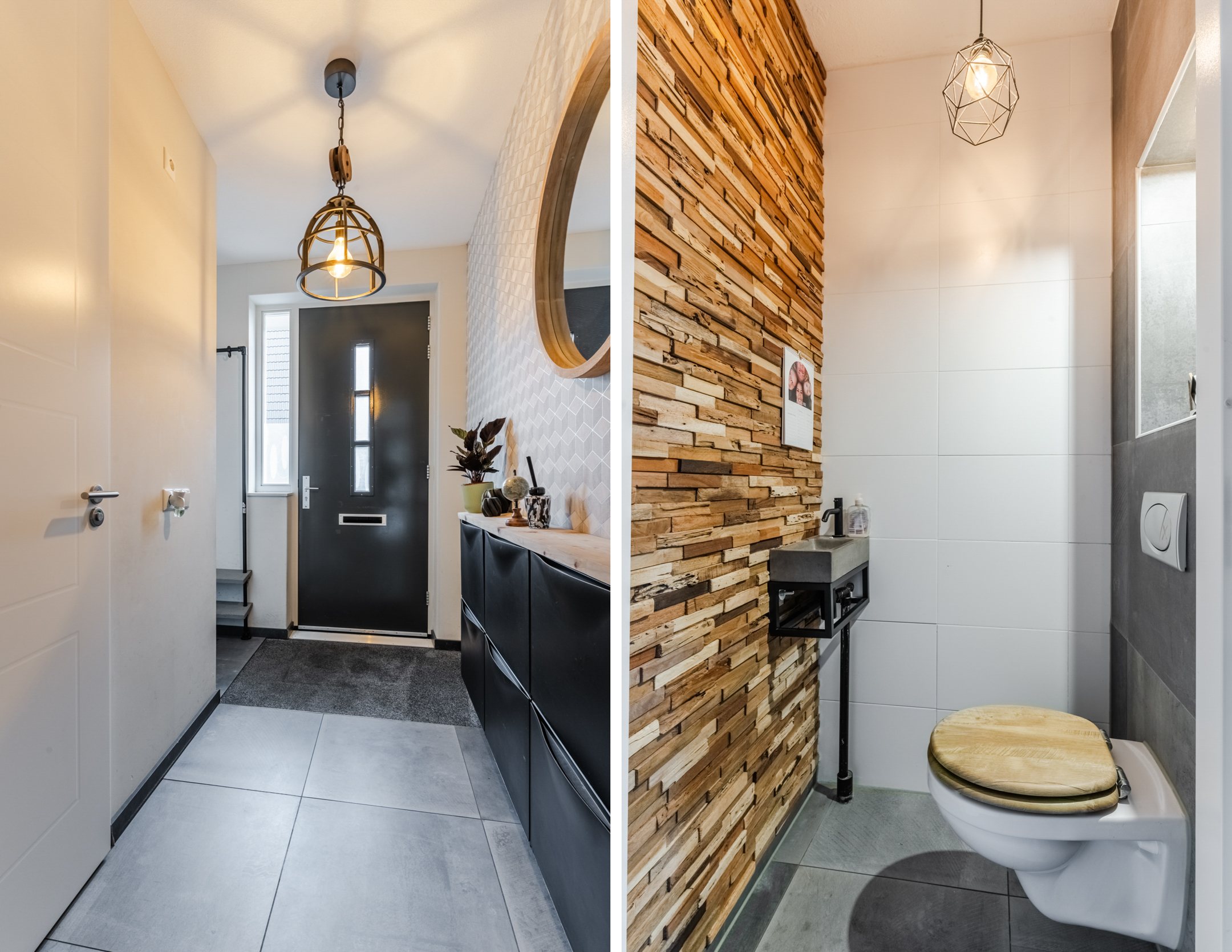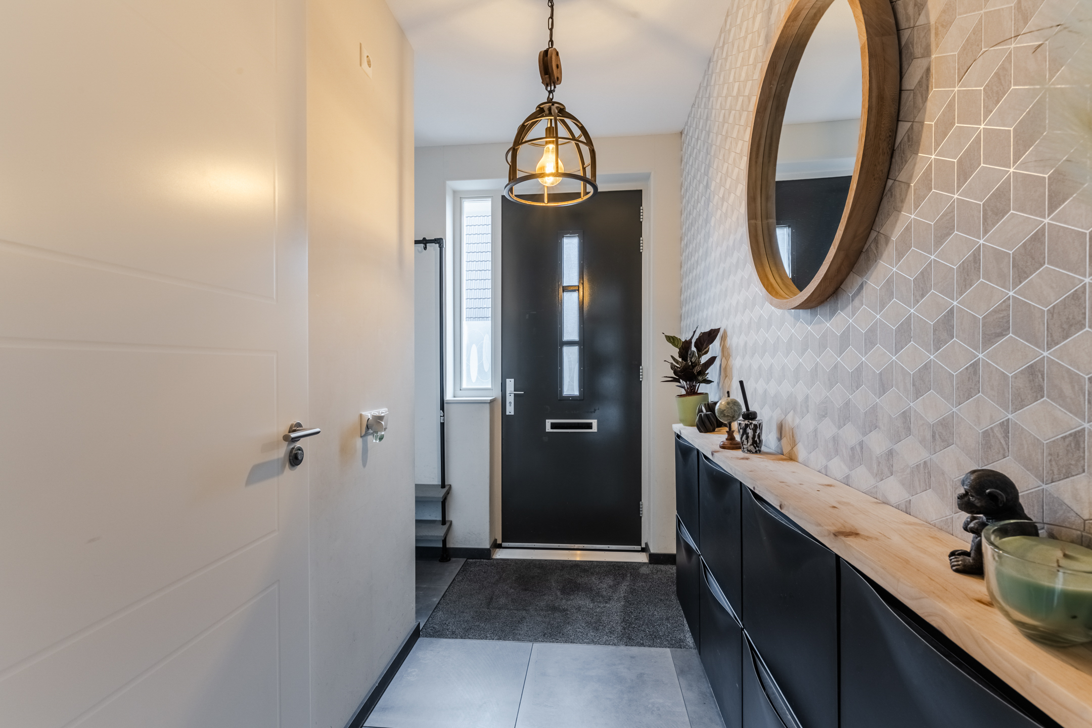 Bij binnenkomst in de hal treft u het toilet, de trapopgang en de toegang tot de woonkamer. Het toilet is netjes afgewerkt, volledig betegeld tot het plafond en voorzien van een fontein. De deur van de hal naar de woonkamer heeft melkglas, wat zorgt voor extra lichtinval.