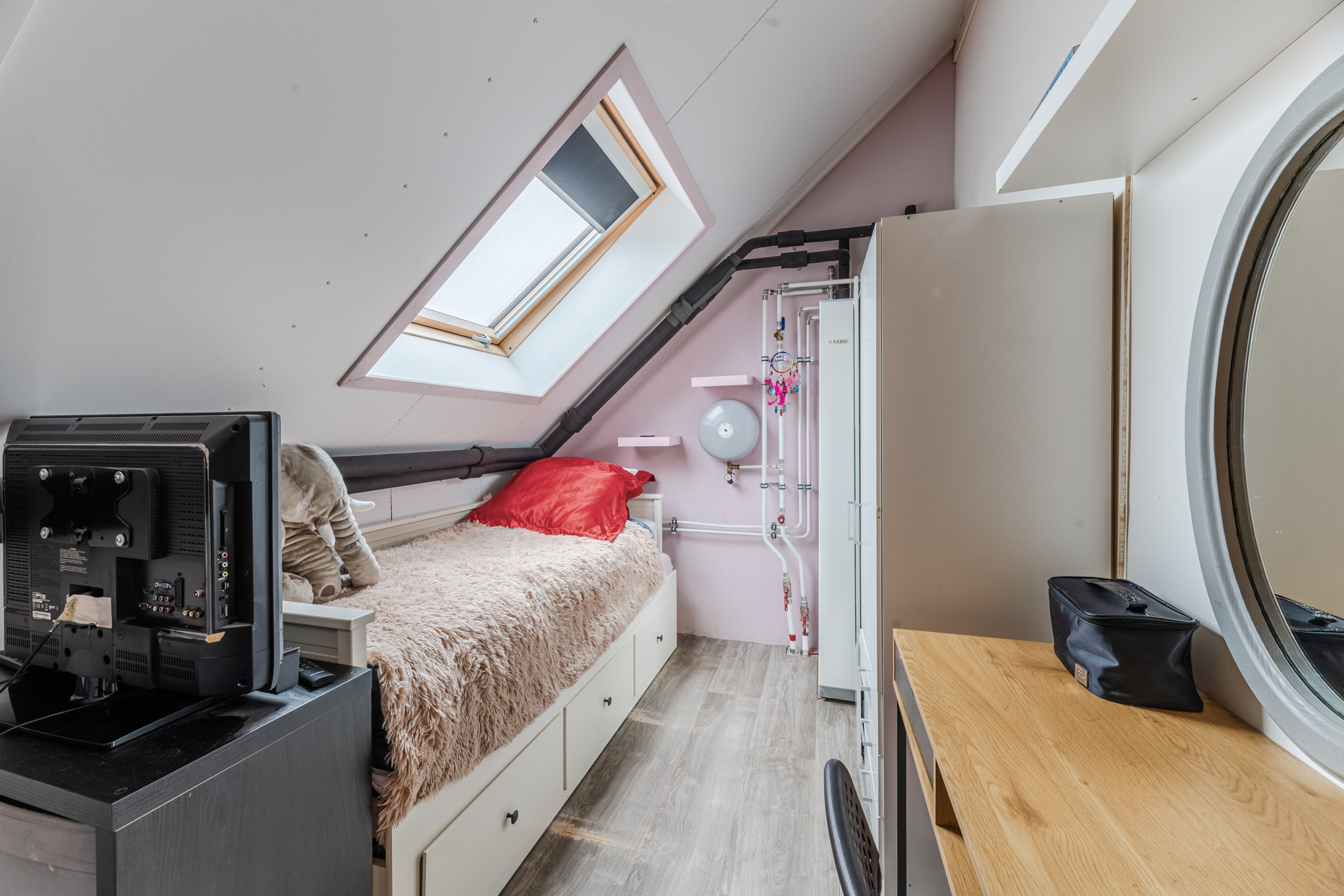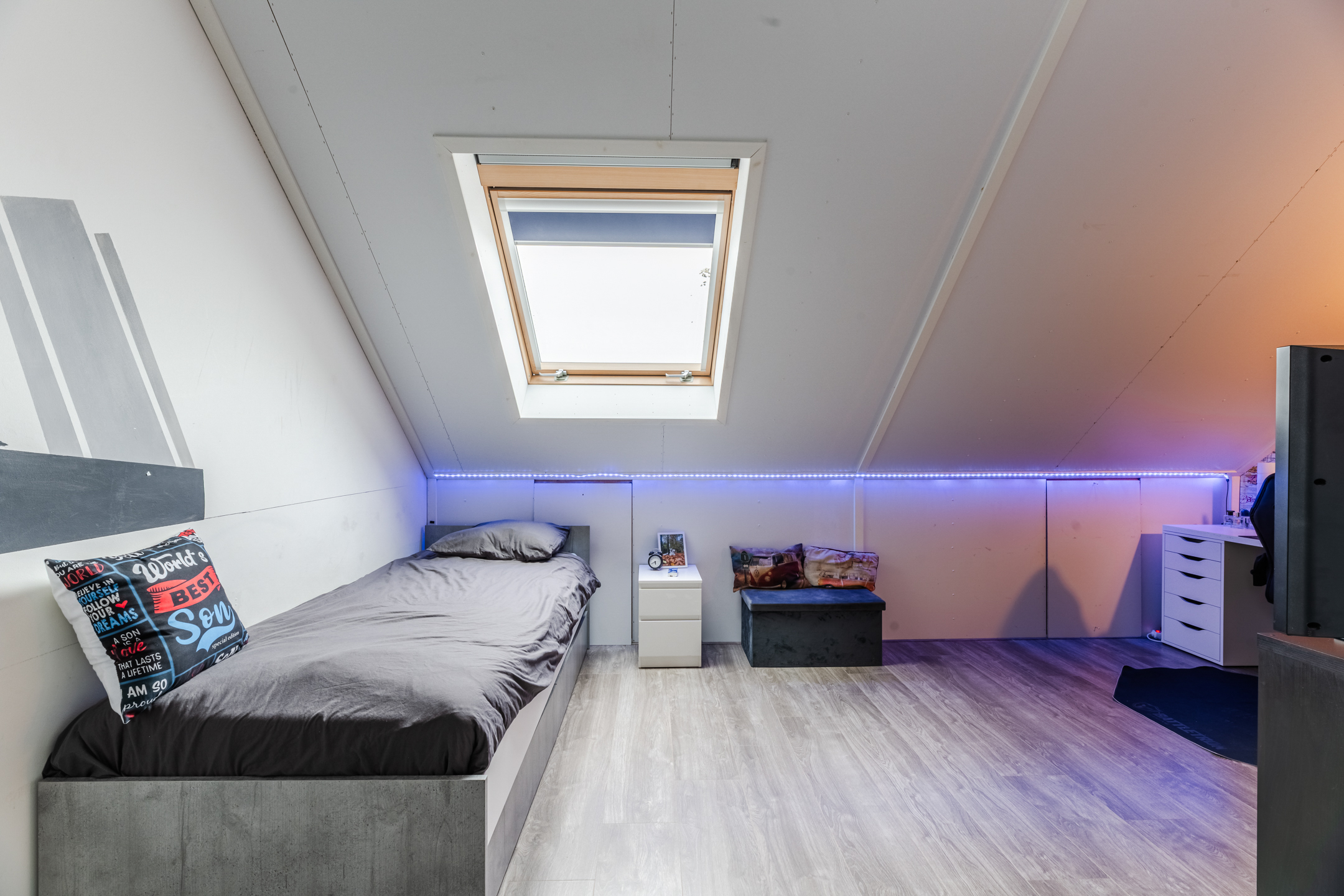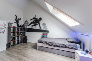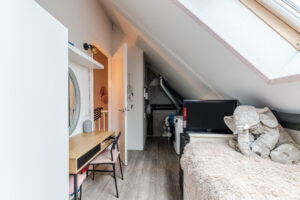 De tweede ruimte is een vierde slaapkamer, voorzien van vloerverwarming en een groot Velux dakraam, wat zorgt voor een aangename en lichte ruimte.