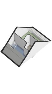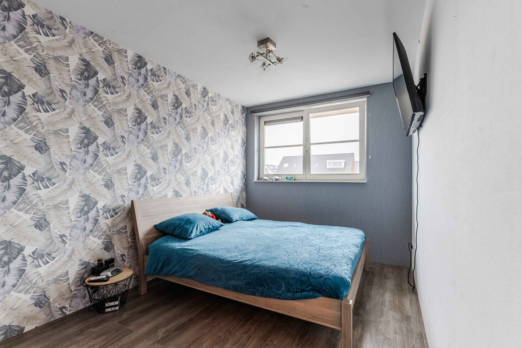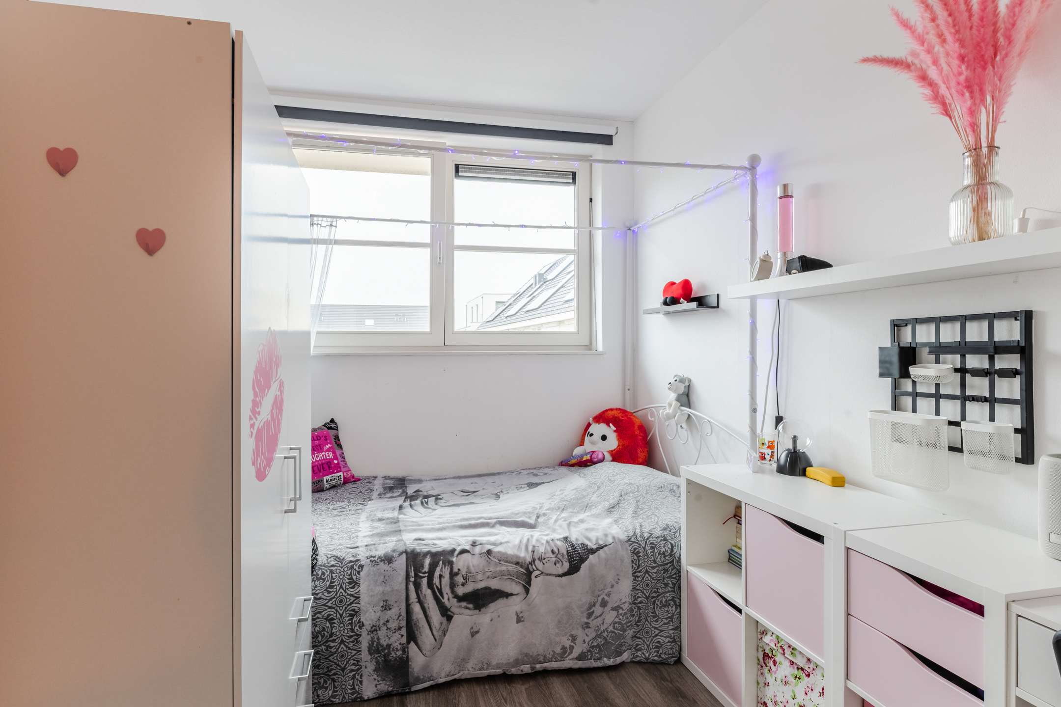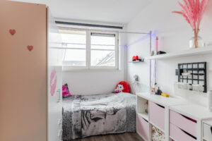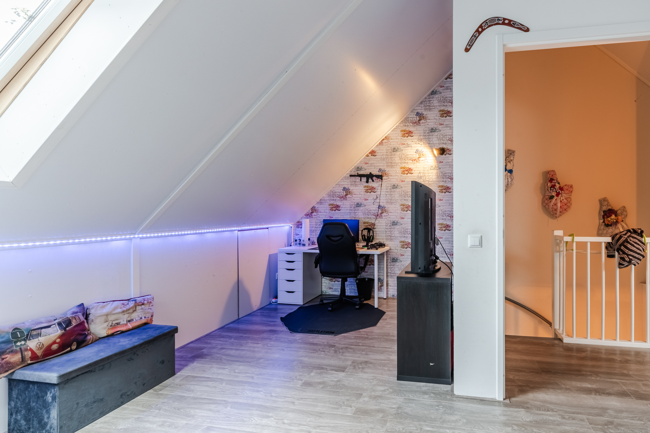 De tweede ruimte is een vierde slaapkamer, voorzien van vloerverwarming en een groot Velux dakraam, wat zorgt voor een aangename en lichte ruimte.