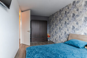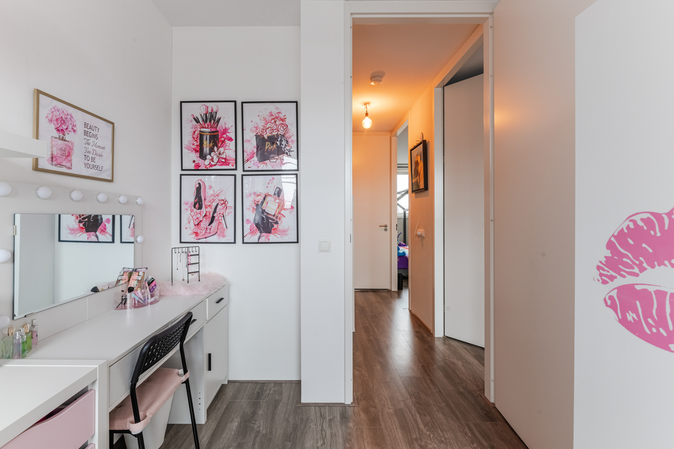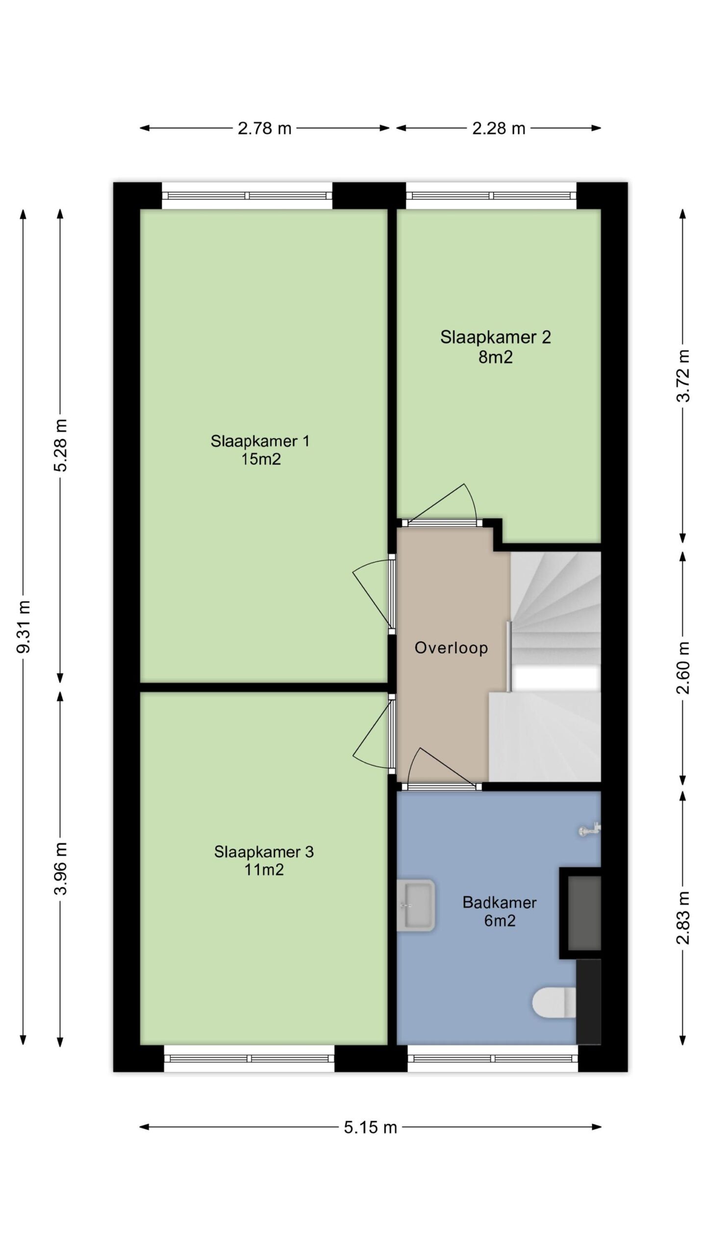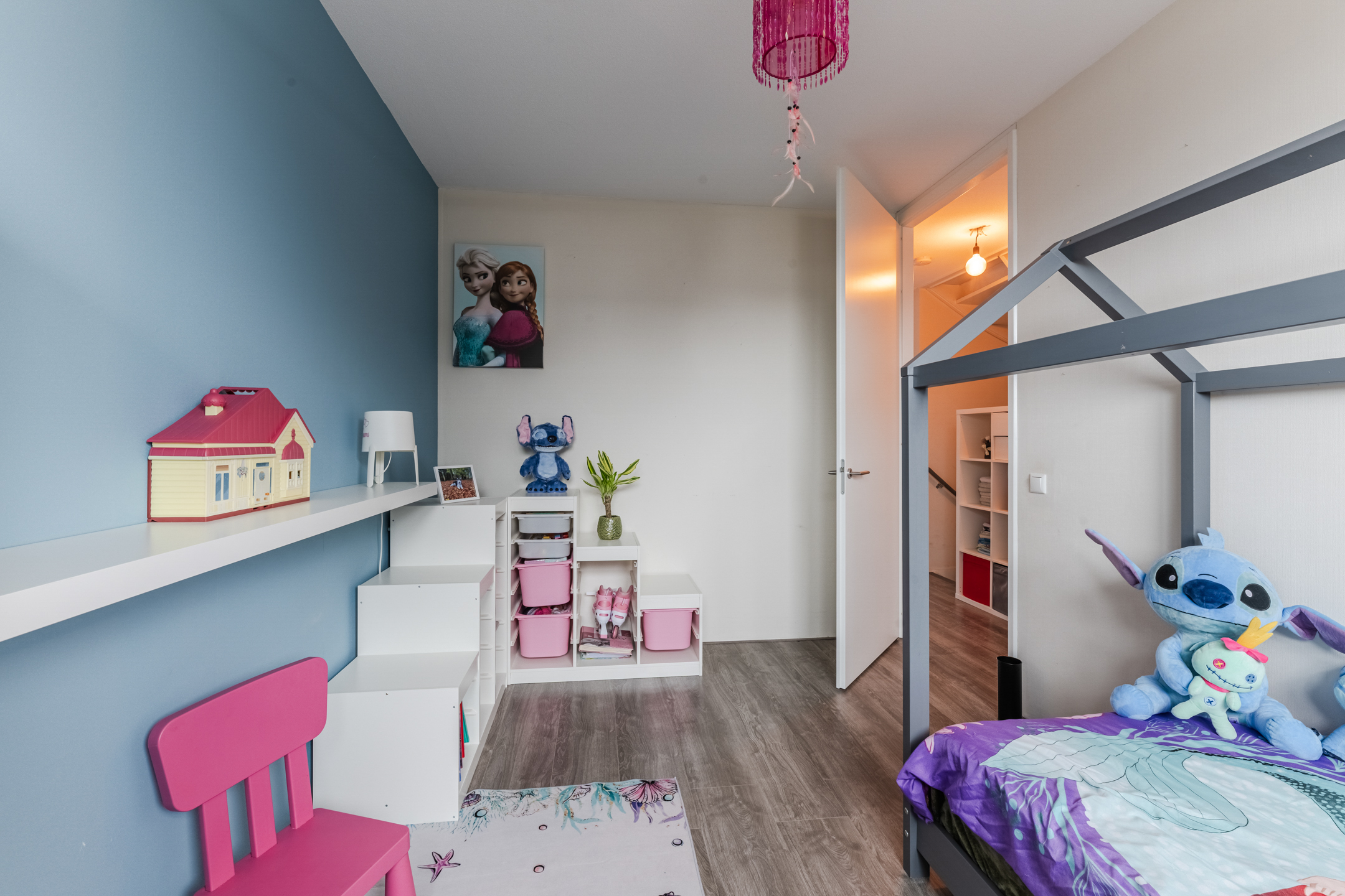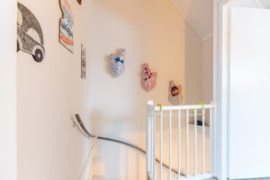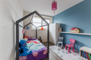Op de eerste verdieping bevinden zich drie slaapkamers van circa 15 m², 11 m² en 8 m². De kamers zijn afgewerkt met laminaat dat netjes doorloopt over de hele verdieping, behang op de wanden en spuitwerk op het plafond. De woning is daarnaast voorzien van plafondhoge binnendeuren zonder bovenlicht, wat een strakke uitstraling geeft.
