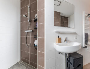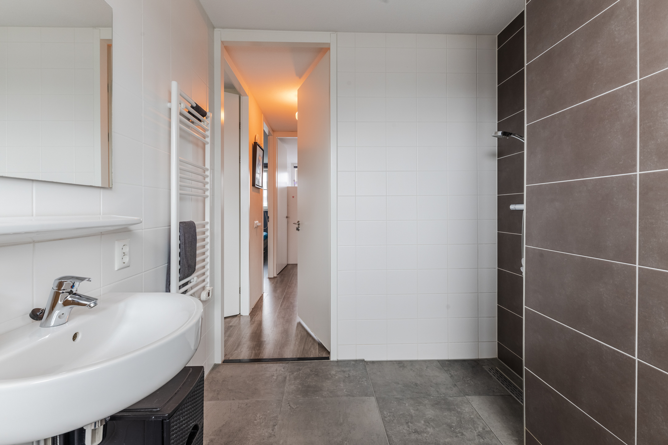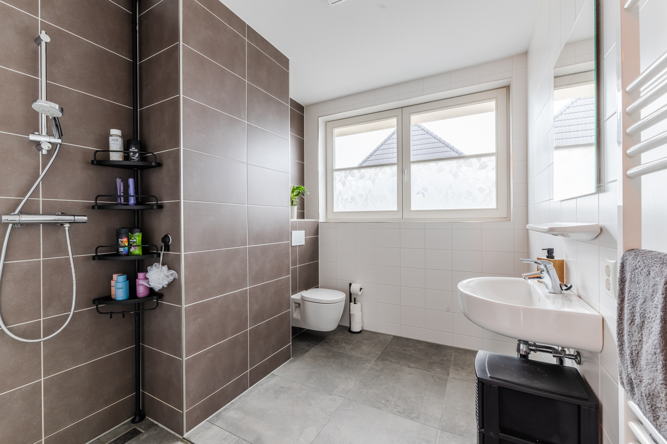 De badkamer is functioneel en neutraal uitgevoerd met bruin en witte tegels en beschikt over een groot raam, losse witte wastafel, hangend toilet, douche op afschot getegeld en een designradiator.