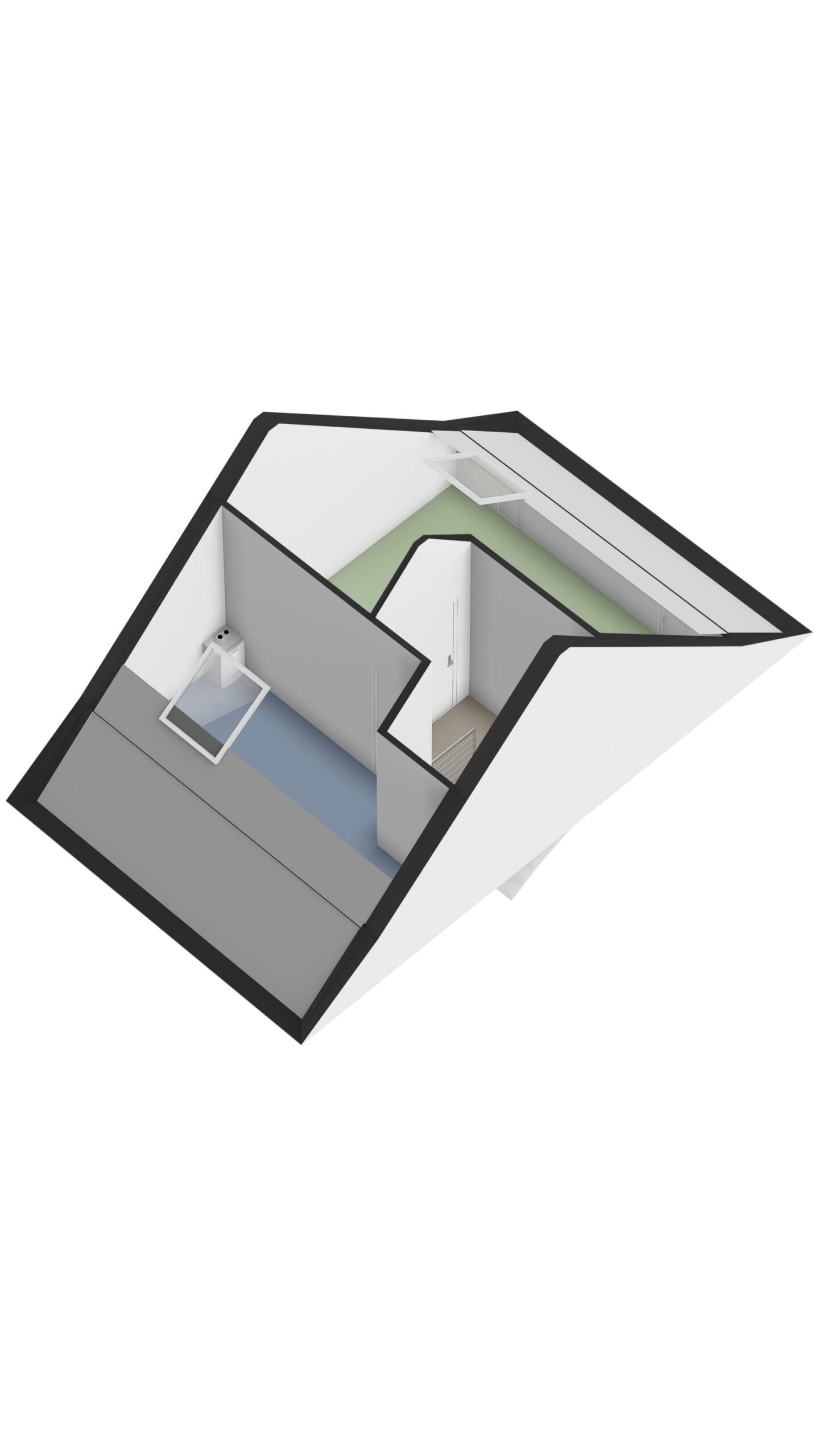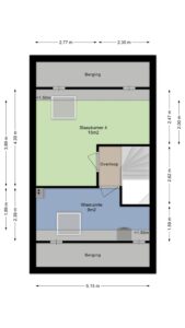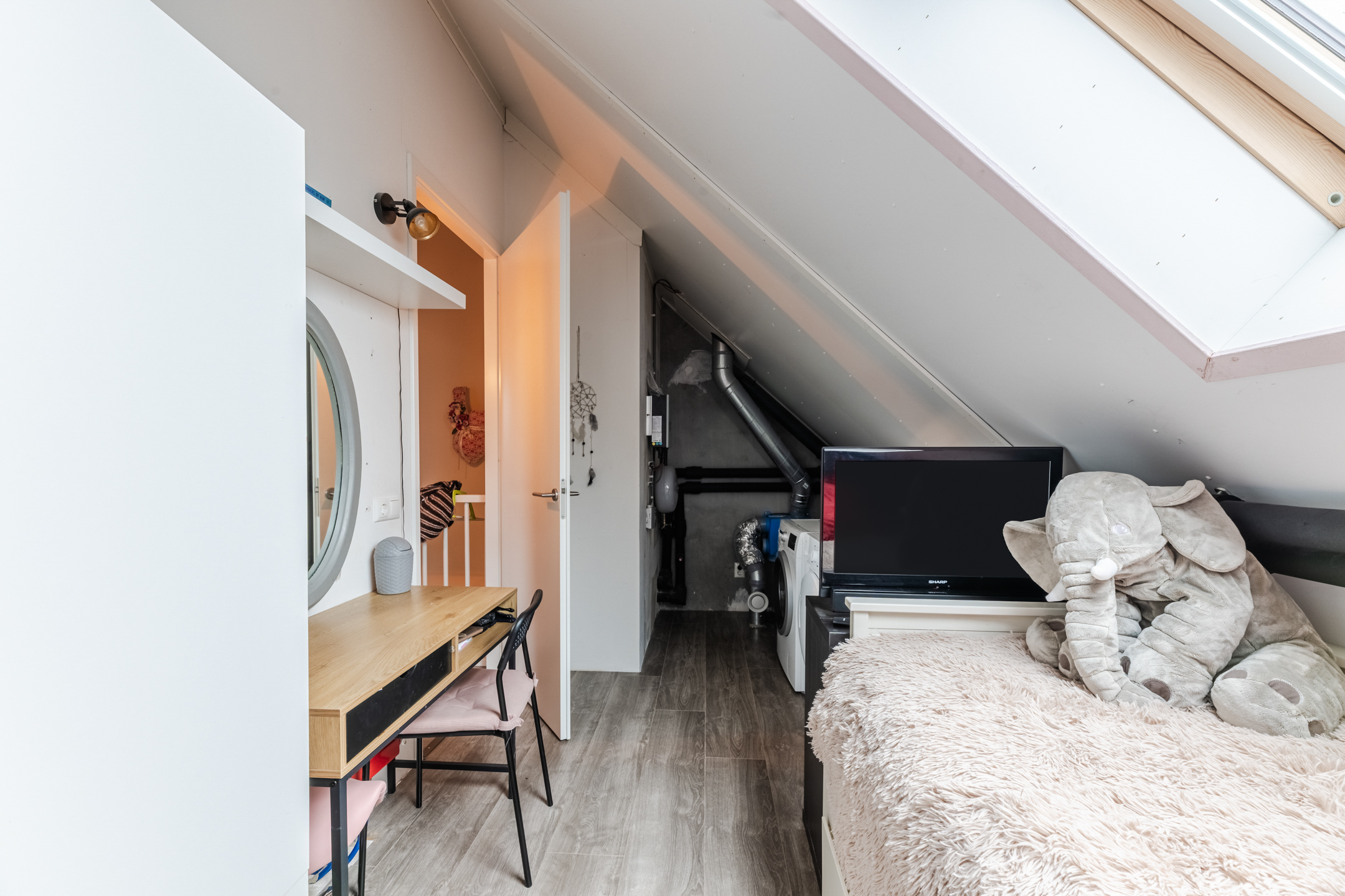 De zolder is praktisch ingedeeld in twee aparte ruimtes. Eén ruimte is ingericht als was- en technische ruimte, waar zich de aansluitingen voor wasmachine en droger bevinden, evenals de warmtepomp en mechanische ventilatie. Deze ruimte heeft een Velux dakraam voor daglicht en ventilatie.