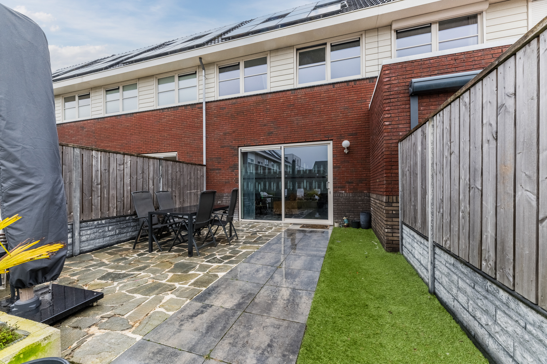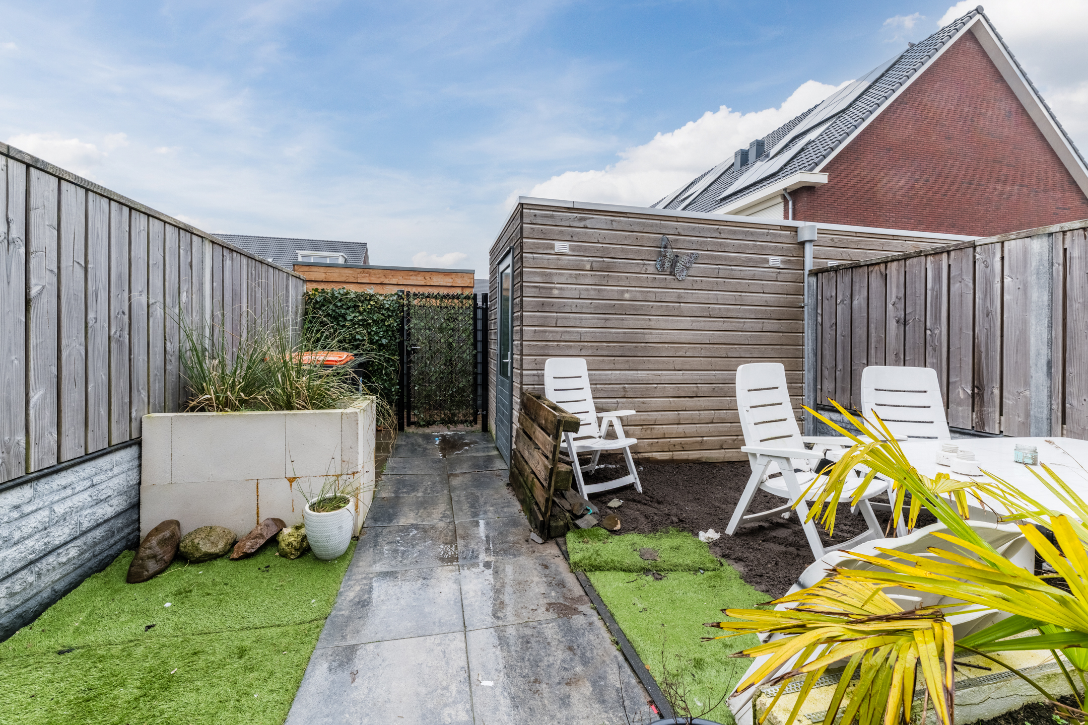De achtertuin is praktisch en onderhoudsvriendelijk ingericht met een combinatie van tegels, kunstgras en plantenborders. De erfafscheiding bestaat uit een schutting met steenstrips en hout, wat zorgt voor een nette uitstraling. Achterin de tuin staat een berging, geschikt voor het stallen van fietsen en extra opbergruimte. Daarnaast beschikt de tuin over een achterom.