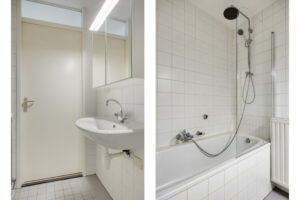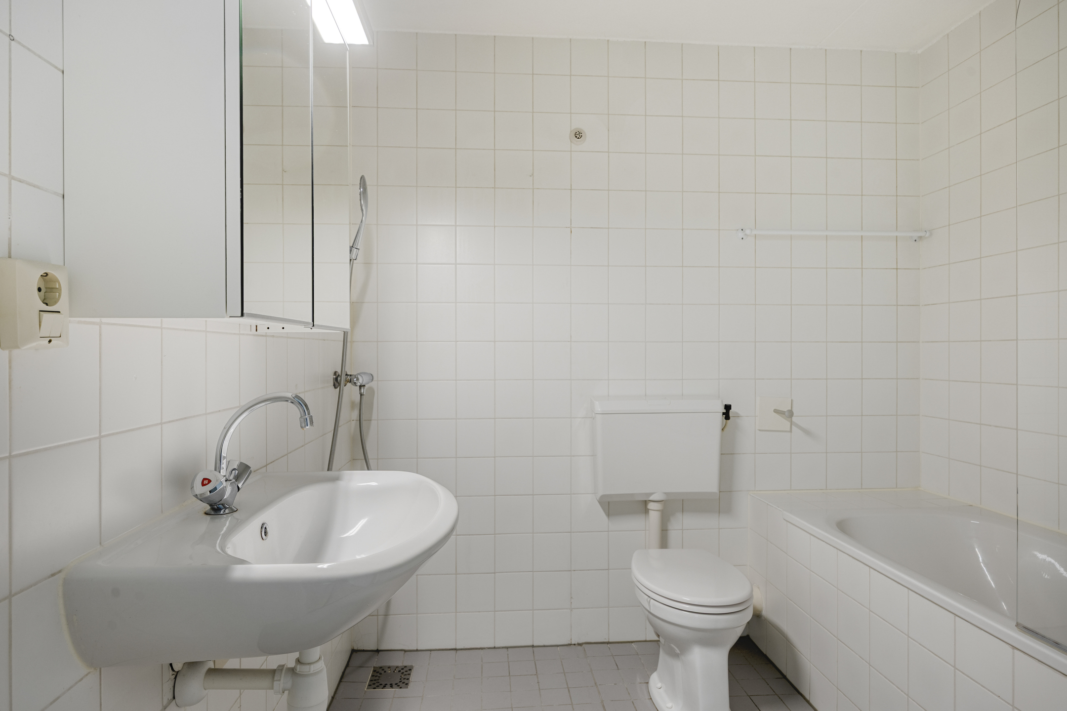 Licht betegeld badkamer voorzien van een vaste wastafel, ligbad, aparte douche en toilet.