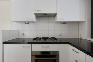Half open keuken. De keukeninrichting is voorzien van een 4 pits gasfornuis, afzuigkap, koelkast, combi magnetron en vaatwasser.