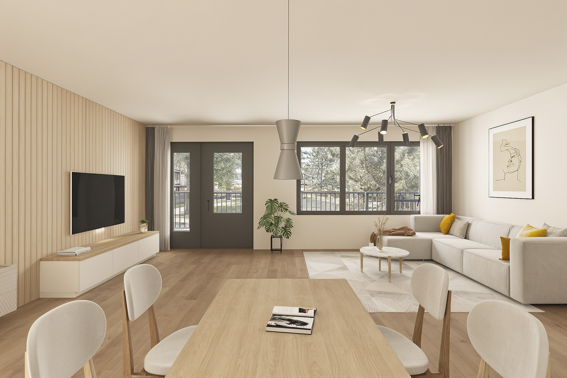 Sfeervolle en ruime woonkamer circa 42m² (inclusief keuken) met prachtige laminaatvloer (2025) en vele raampartijen, die een fraai zicht op de groene binnentuin geven. Een deur geeft toegang tot het balkon.