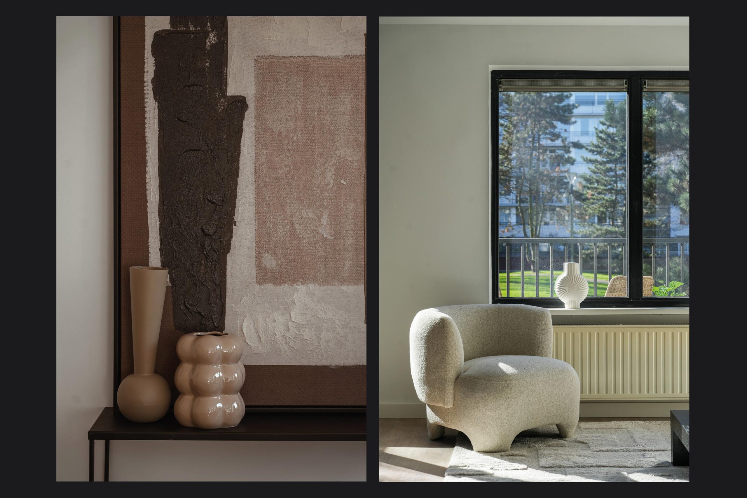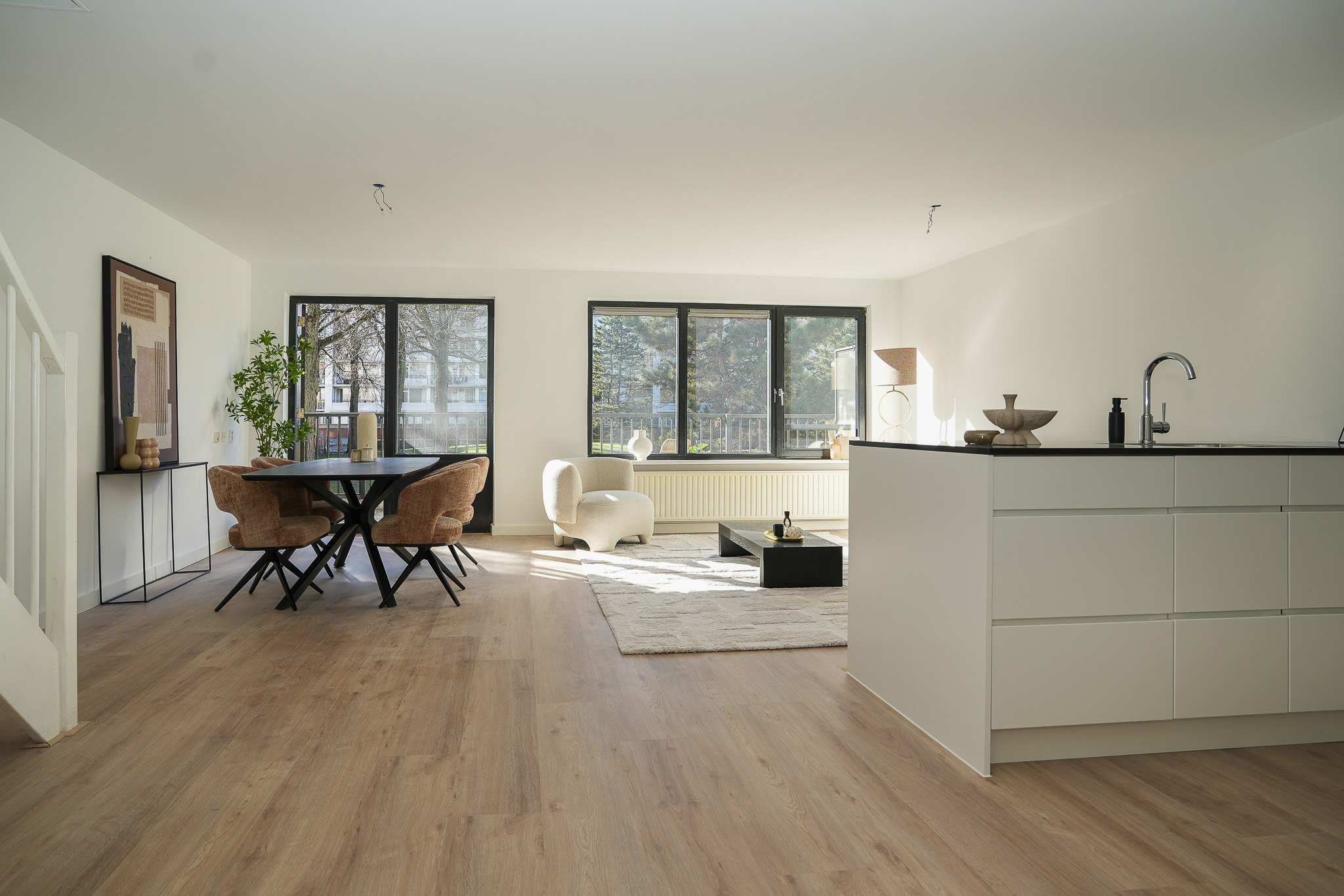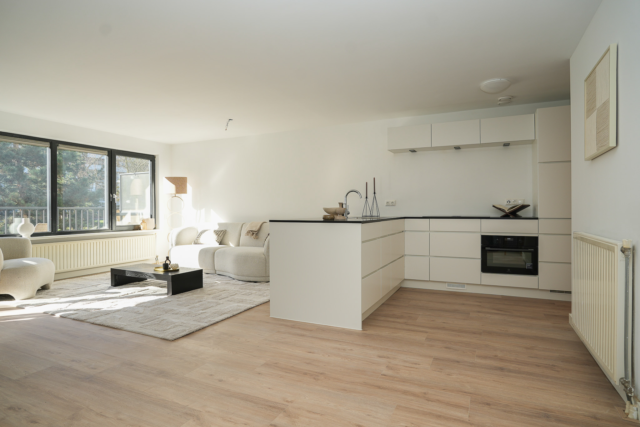 Sfeervolle en verrassend ruime woonkamer van circa 42 m² (inclusief keuken) met een fraaie laminaatvloer (2025). De grote raampartijen zorgen voor veel daglicht en een prettig uitzicht op de groene binnentuin. Vanuit de woonkamer is het balkon bereikbaar.