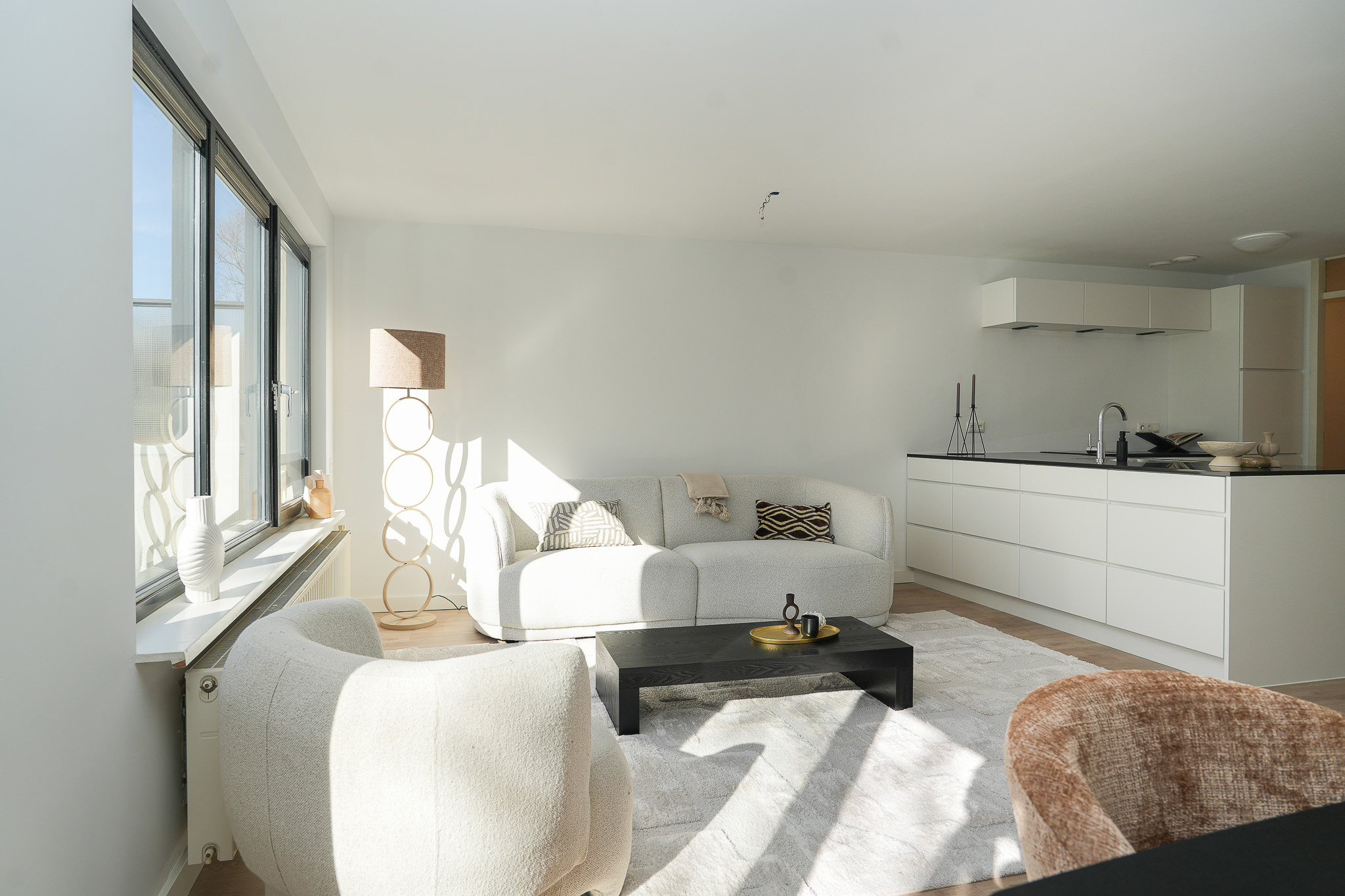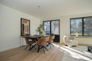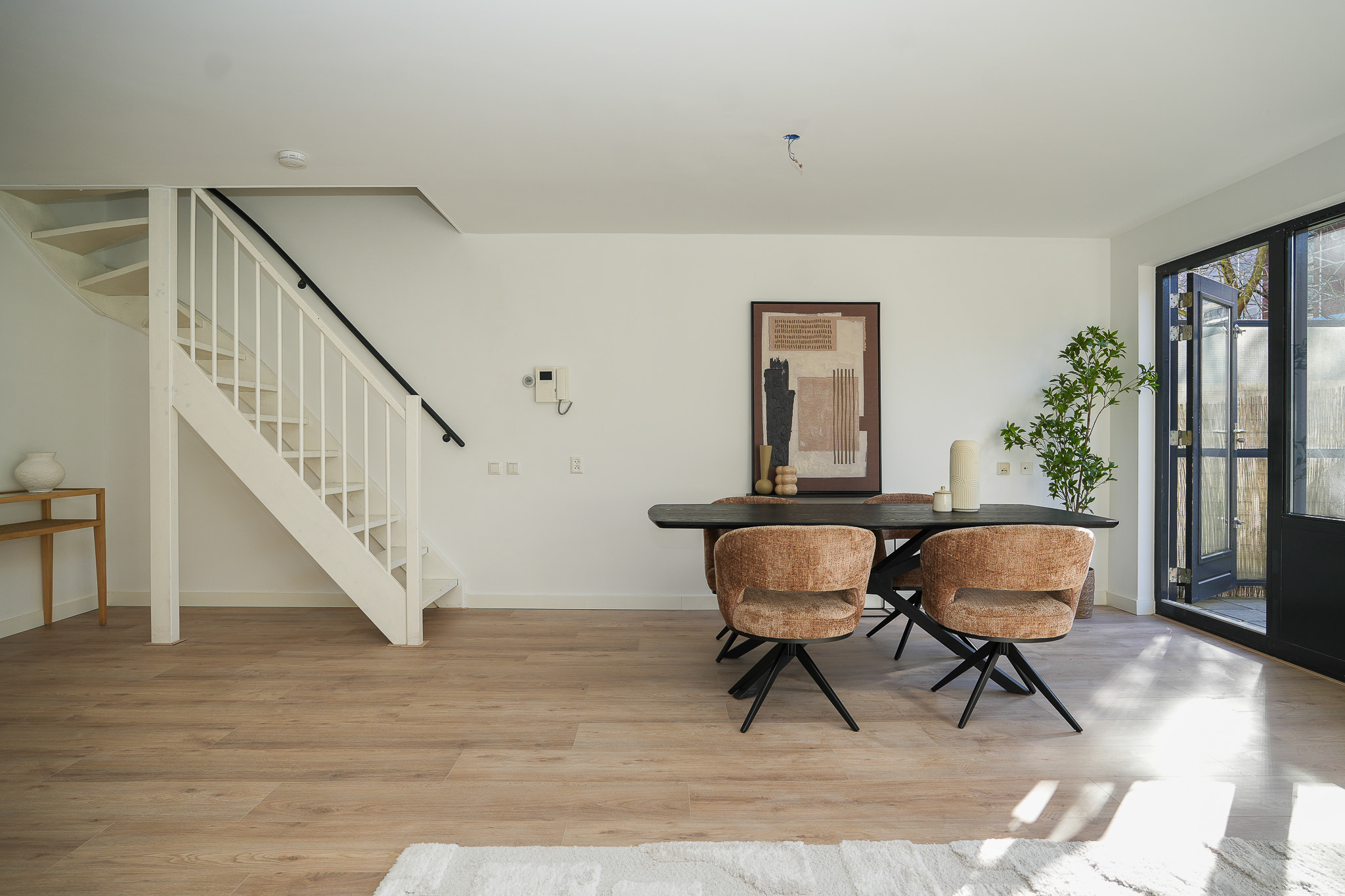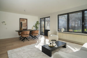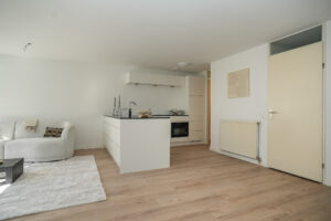 • Woonkamer voorzien van nieuwe vloer en gestucte wanden en plafond