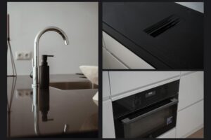 De open keuken (2025) heeft een moderne hoekopstelling en is compleet uitgevoerd met een granieten werkblad, inductiekookplaat met geïntegreerde afzuiging, koelkast, vriezer, combi-magnetron en vaatwasser.